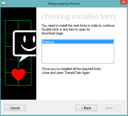 during the repackaging wizard process, it tells me that i dont have the font "papyrus" installed. I do have papyrus installed i think, but no matter what, it keeps saying it, and it wont let me through the repackaging wizard process. it says that i can doubleclick on the listed fonts to get to a download page but when i click on papyrus, it just brings me to a nearly blank page.