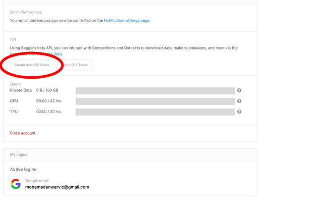 kaggle.json. Create a.kaggledirectory in your home directory and copy this file to~/.kaggle. This can be done using the following commands:mkdir -p ~/.kaggle cp kaggle.json ~/.kaggle chmod 600 ~/.kaggle/kaggle.json -