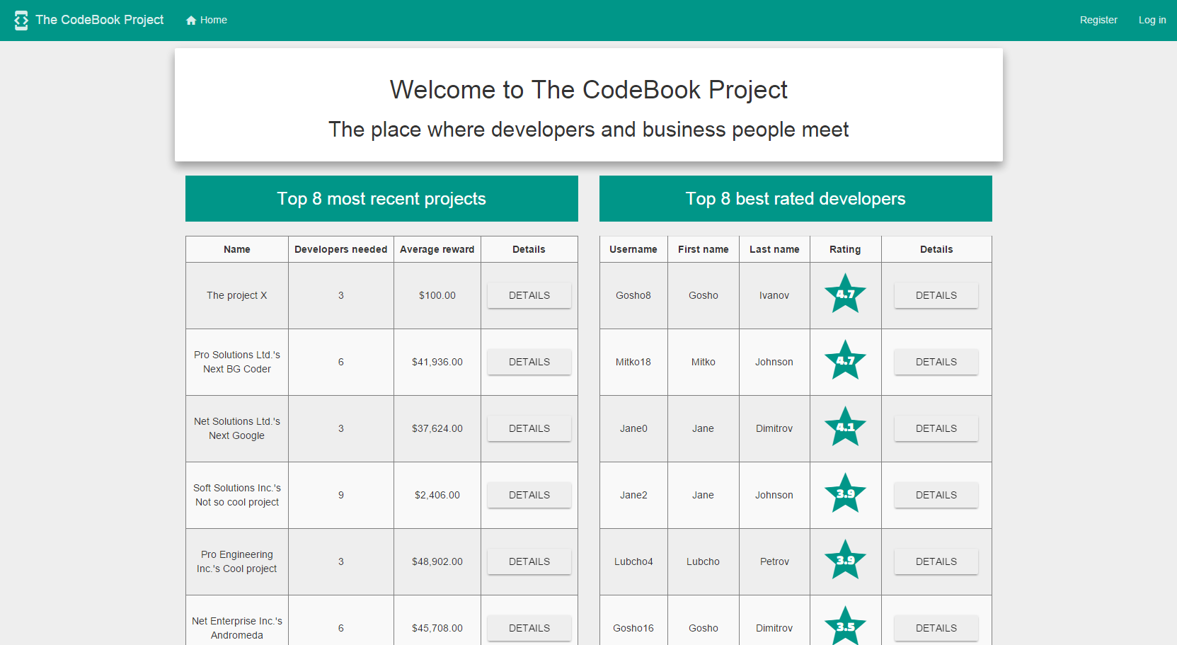 The CodeBook Project is an easy way for businessmen and developers from all over the world to connect to each other. You have a great idea but you need a team to write the code? No problem, the CodeBook Project is here for you. Creating a new business project has never been easier. It is just on a few clicks away from you. Assemble your team of developers based on their skills, filter them according their rating and develop the next world-changing application.