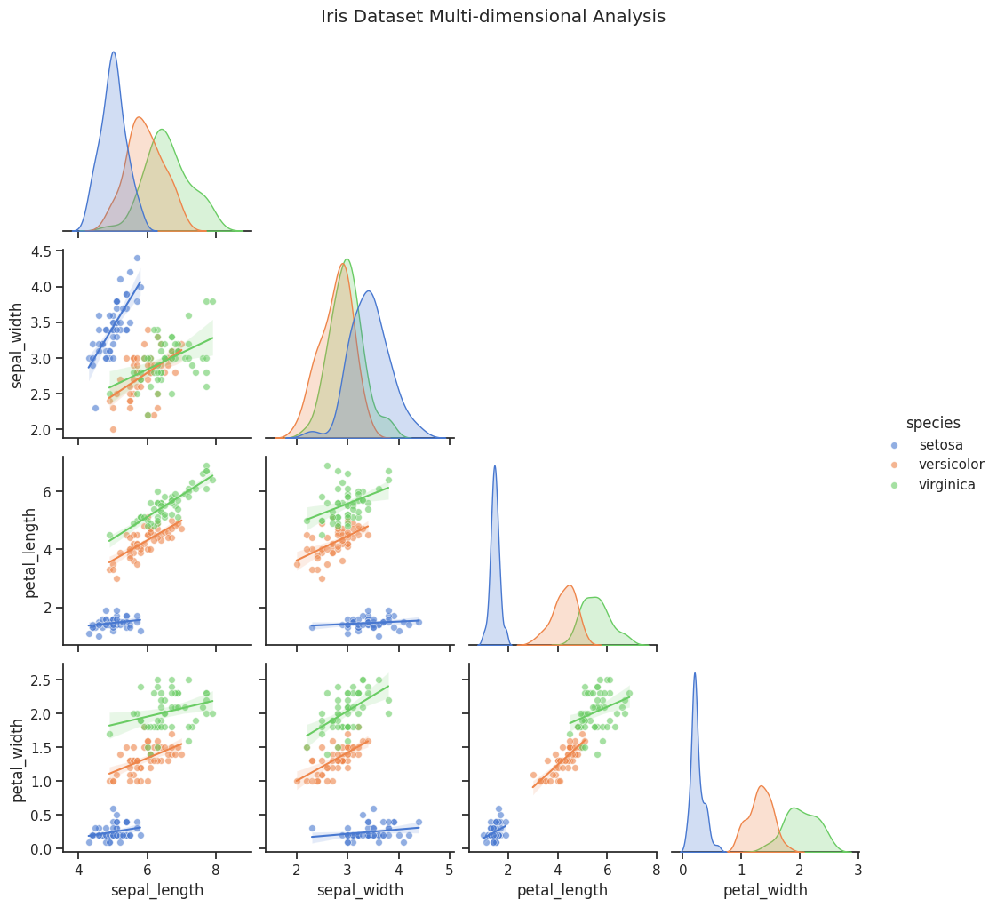 Analysis: The pair plot matrix provides a comprehensive visualization of the 4D feature space. Observations indicate that Iris setosa occupies a distinctly isolated cluster across all petal-related dimensions. Conversely, Iris versicolor and Iris virginica exhibit significant overlap in sepal measurements, though they begin to diverge linearly as petal length increases. This visualization identifies petal characteristics as the primary discriminatory variables for species classification.