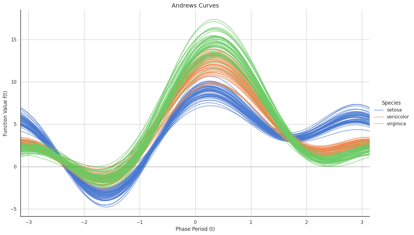 Analysis: Andrews Curves map the multi-dimensional biometric vectors into a functional domain. The resulting waveforms reveal a clear "harmonic" distinction for Iris setosa, while Iris versicolor and Iris virginica display nearly identical phase and frequency patterns. This "phase resonance" suggests that the latter two species share a similar morphological blueprint, confirming their status as near-neighbors in the feature space.