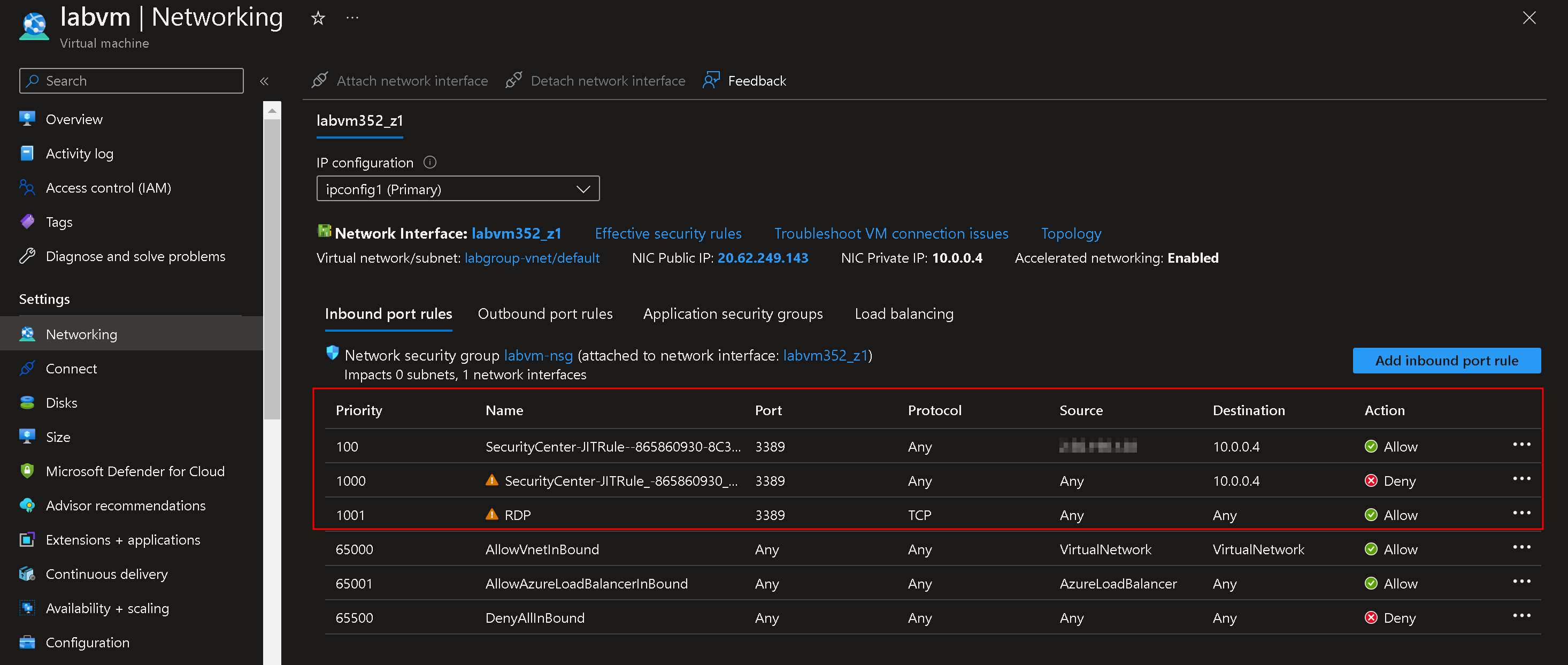 If we go to the networking tab for our VM we can see our rules have been updated. Now RDP traffic is allowed for a certain amount of time only from the IP of your computer. Anyone else who attempts to establish and RDP connection will be blocked via our Just in Time Access rules.