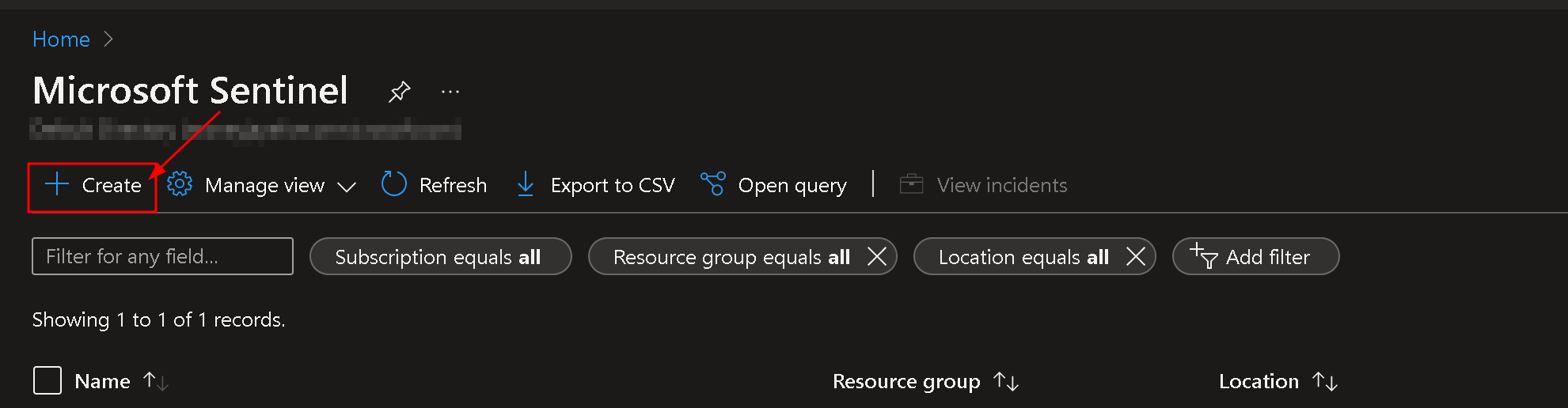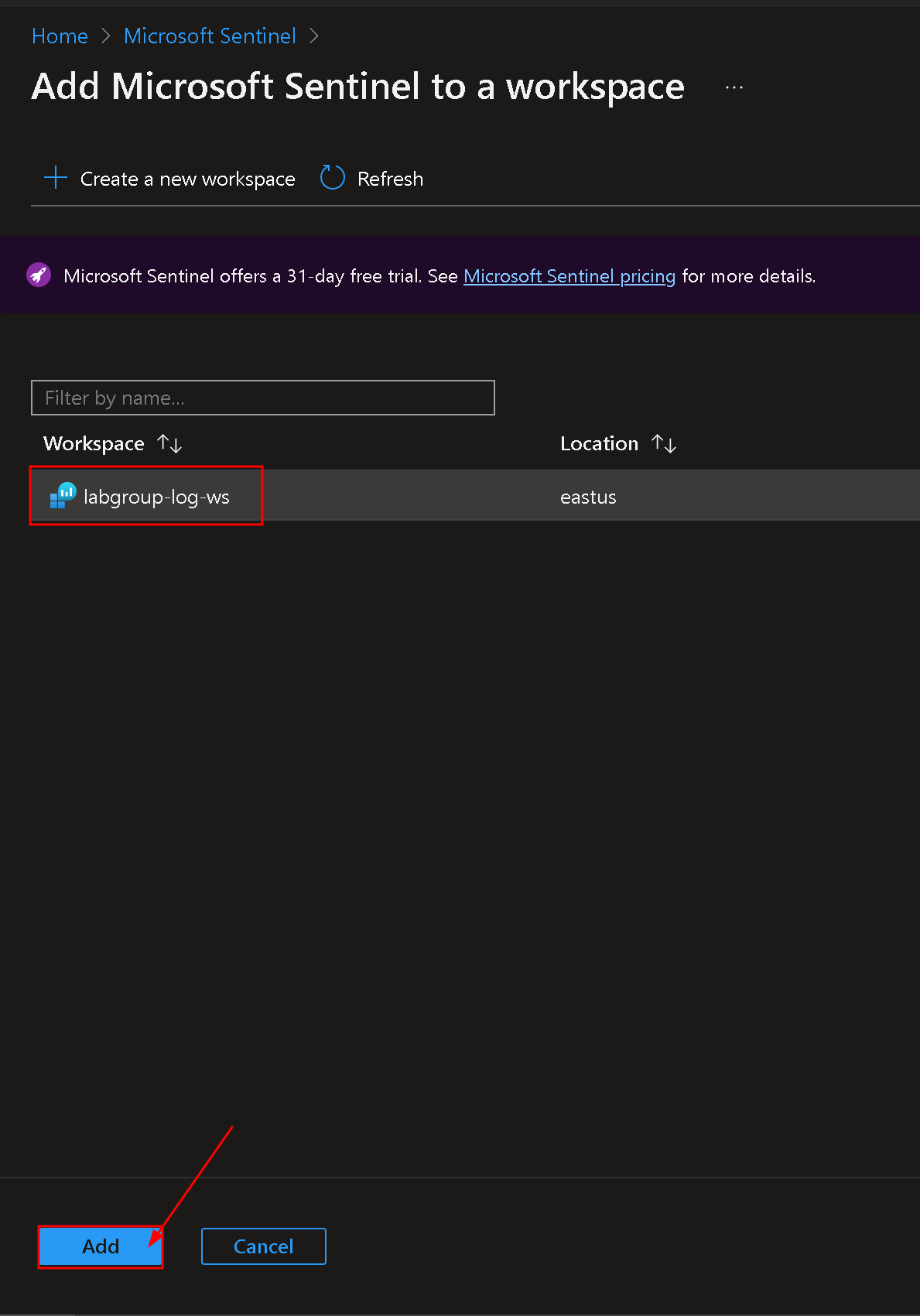 Search “Microsoft Sentinel” in Search Bar in Azure Portal. This will prompt you to create a Log Analytics Workspace.
