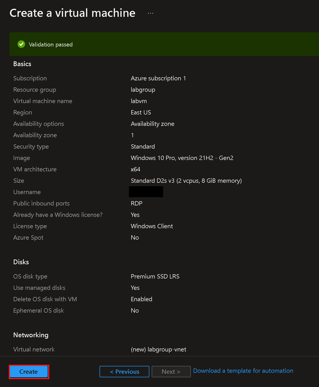 Click Review + create to start the creation of your virtual machine. After selecting to 'Review + Create', you will see a summary of the what has been selected in creating the VM.