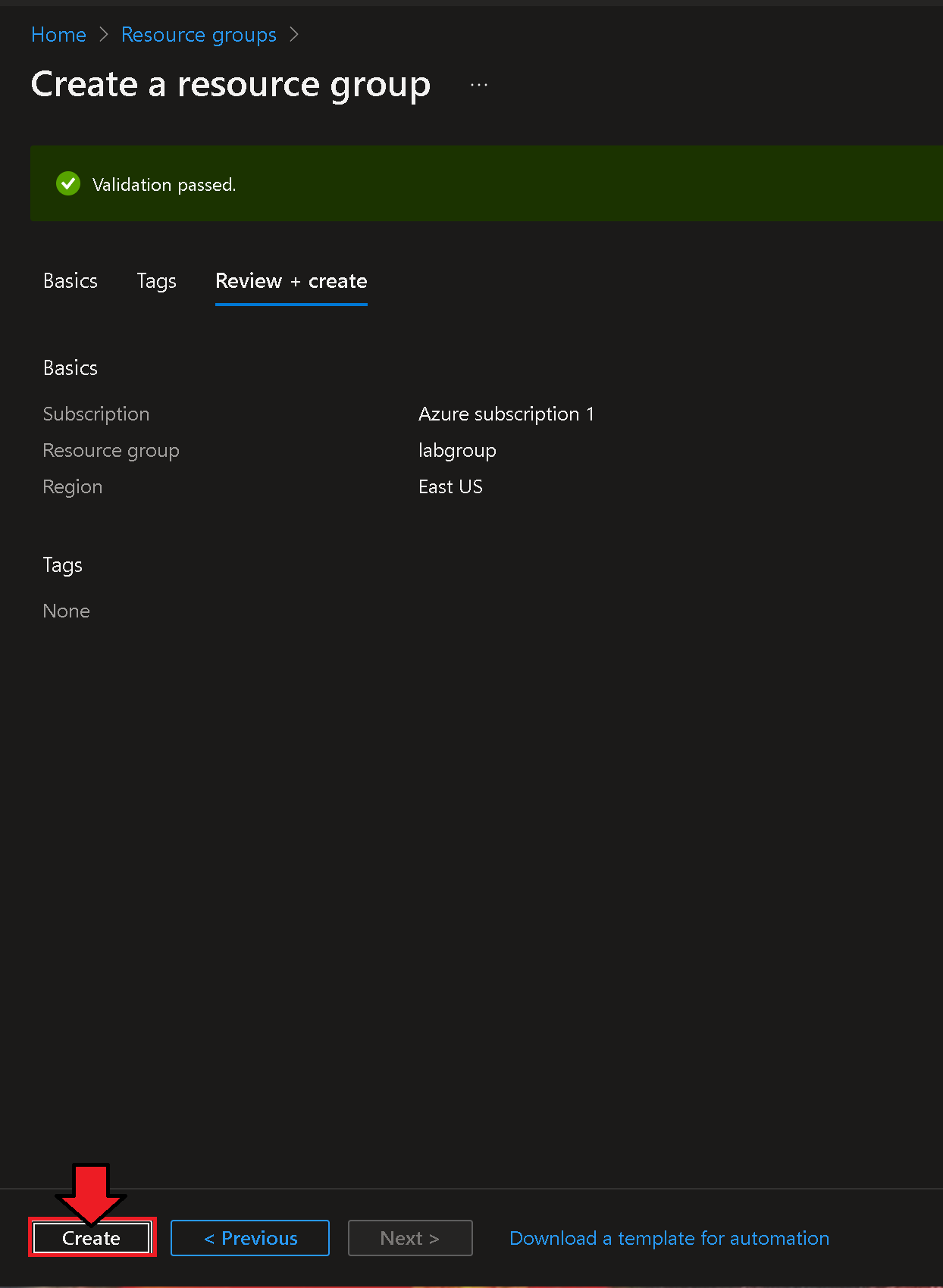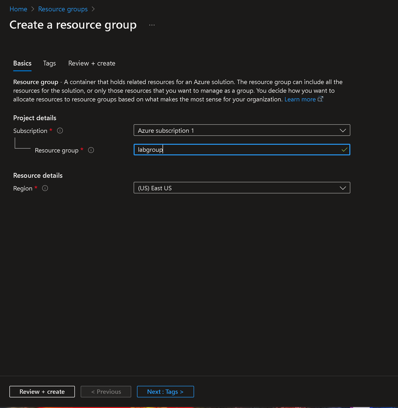 Search “Resource Group” in the Azure Portal Search Bar and Follow the on-screen prompts for the basic tab. Tags will not be required for this lab, so we can move forward by selecting to 'Review + Create' to move forward. Once that's done, you can choose to 'Create' to finalize the creation of the Resource Group.