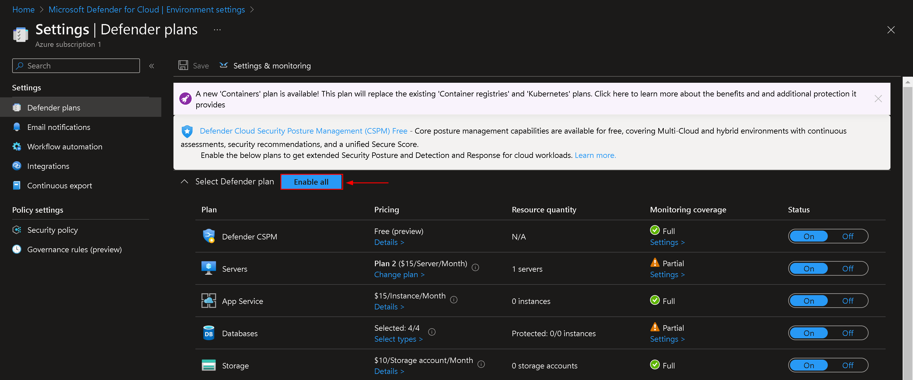 Select your Azure Subscription from the list provided. Upon selection, the following services will be seen on the screen. By default, Enhanced security is off but you will want to select the Enable All Microsoft Defender for Cloud Plans. You will be given a 30 free trial so be sure to disable when finished with the lab to avoid any cost. You can select then “Enable all option” and hit save.