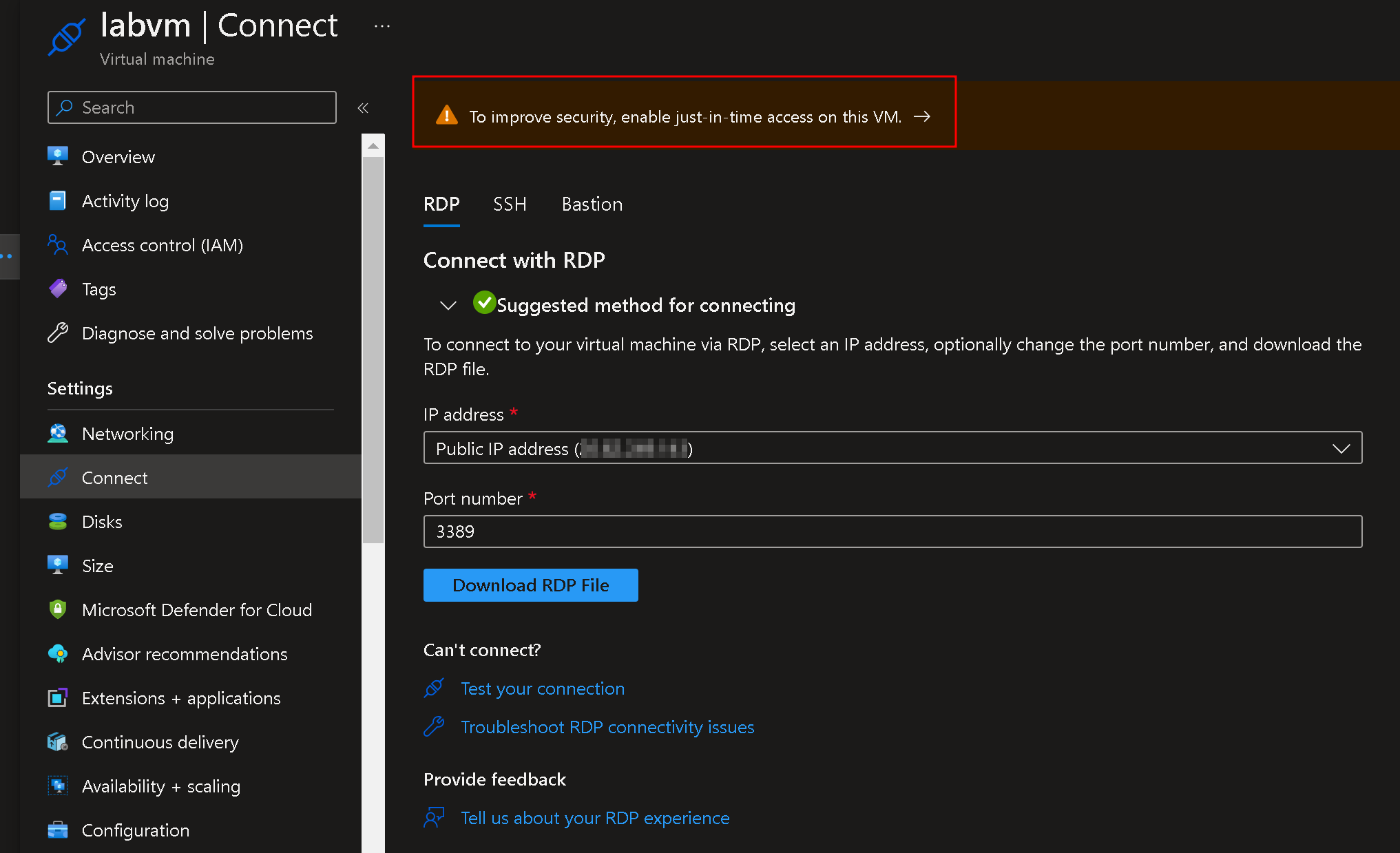 Now, we will go back to our VMs that we created previously and then select 'labvm'. Once labvm is selected, we will choose 'Connect' on the left panel. Upon reaching the connect configuration page, we will select the 'Enable Just-in-time' button.
