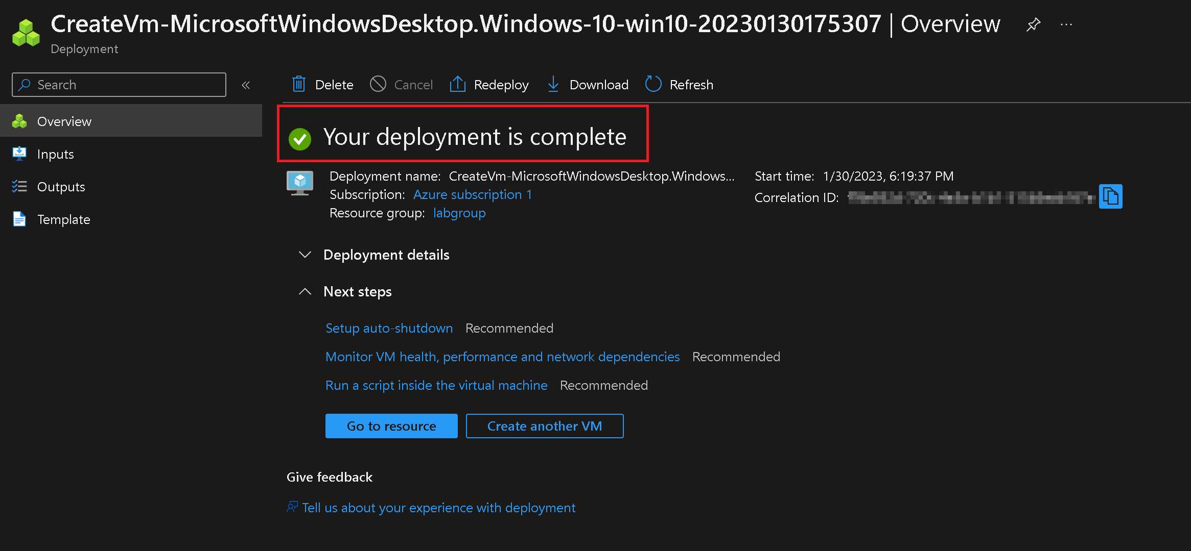Once you have selected to 'Create' in the confirmation page, you will then be presented with messaging showing that 'Your deployment is complete.'