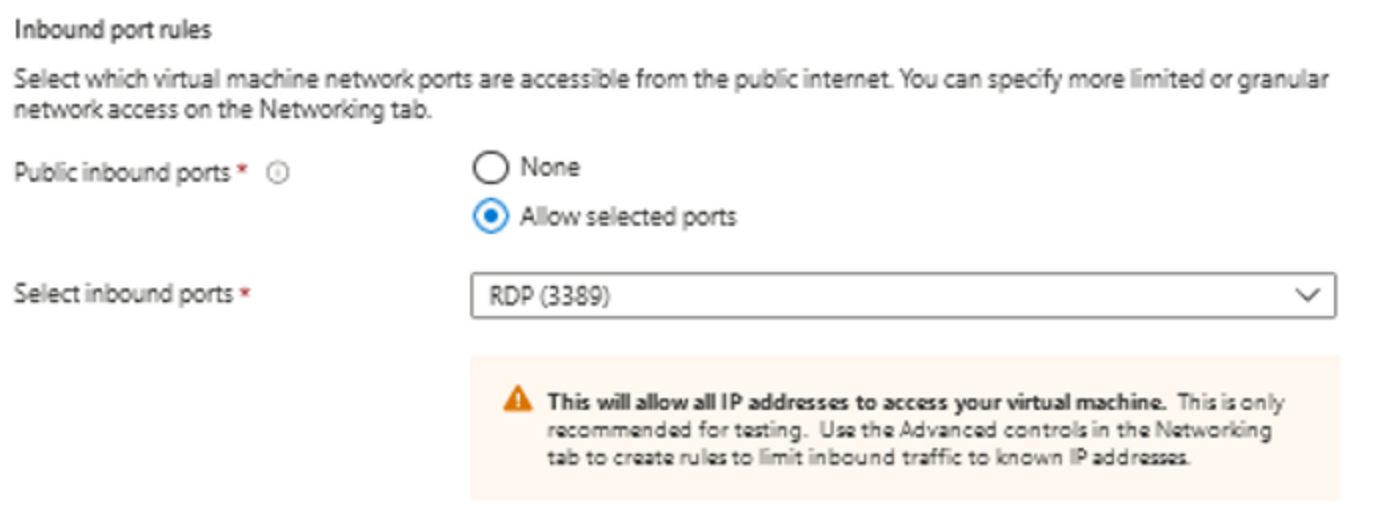 If you look at the first rule (image above), you will see that inbound RDP traffic is allowed from any source to any destination. RDP is necessary to access our VM. However, with this current setting, anyone who obtains our public IP (which can be possibly be obtained via network scan) can potentially connect to the VM as this is public facing. This presents a security risk as it makes the VM vulnerable to possibly a brute force or password spray attack.