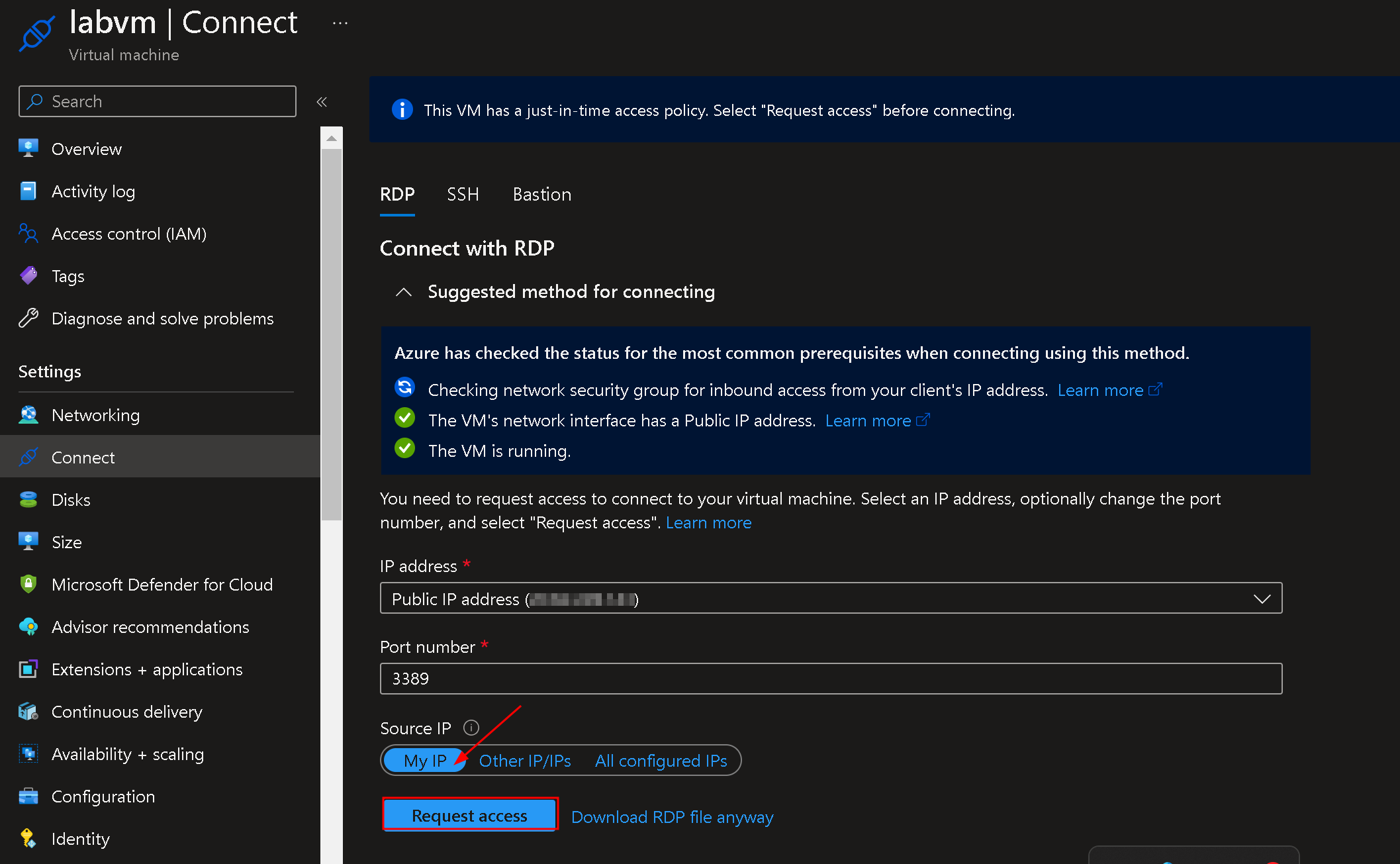 Now that your JIT has been enabled, we will go to your VM settings and click Connect on the left pane. Select “My IP” as Source IP Request Access. Select “Request access”.