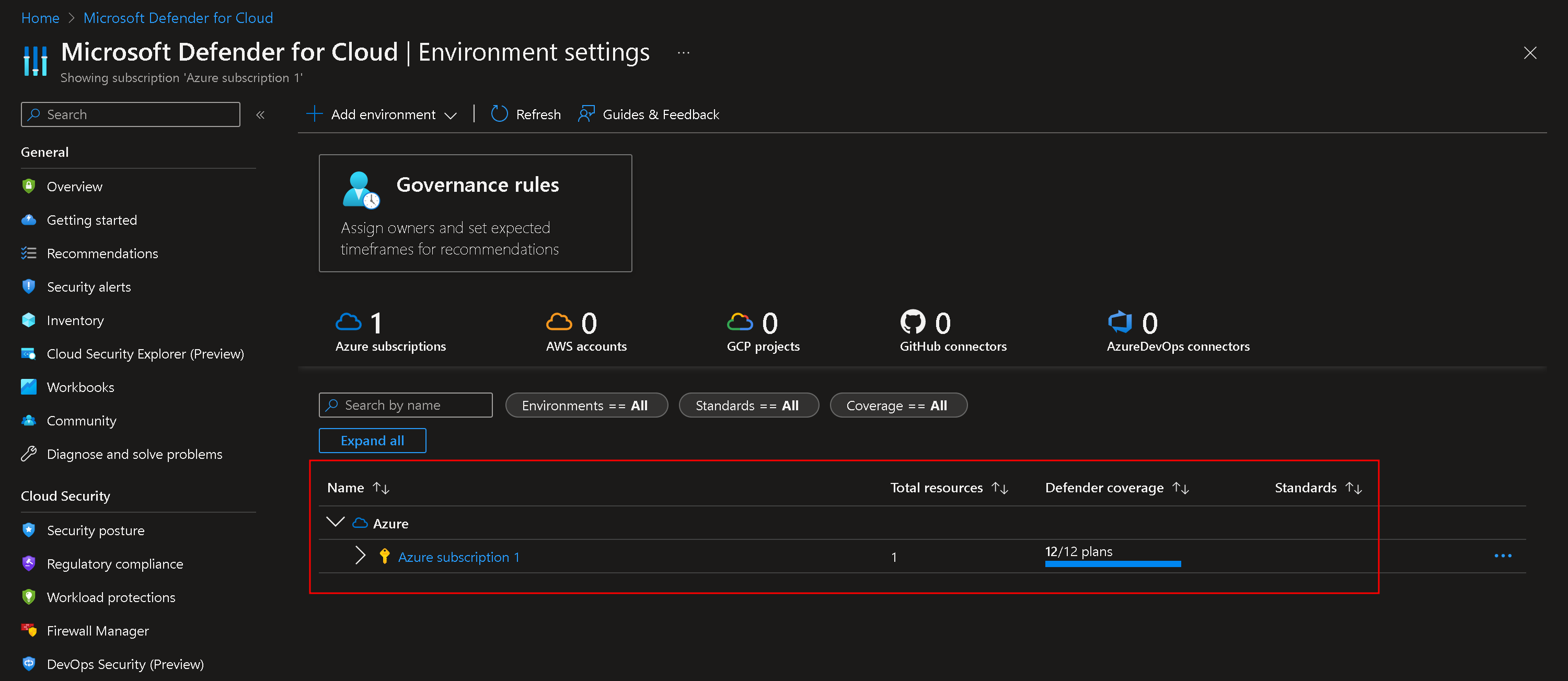 Search "Microsoft Defender for Cloud" in the search bar at the top of the Azure Portal and select the service. You will see a page similar to this. On the left pane select “environment settings”