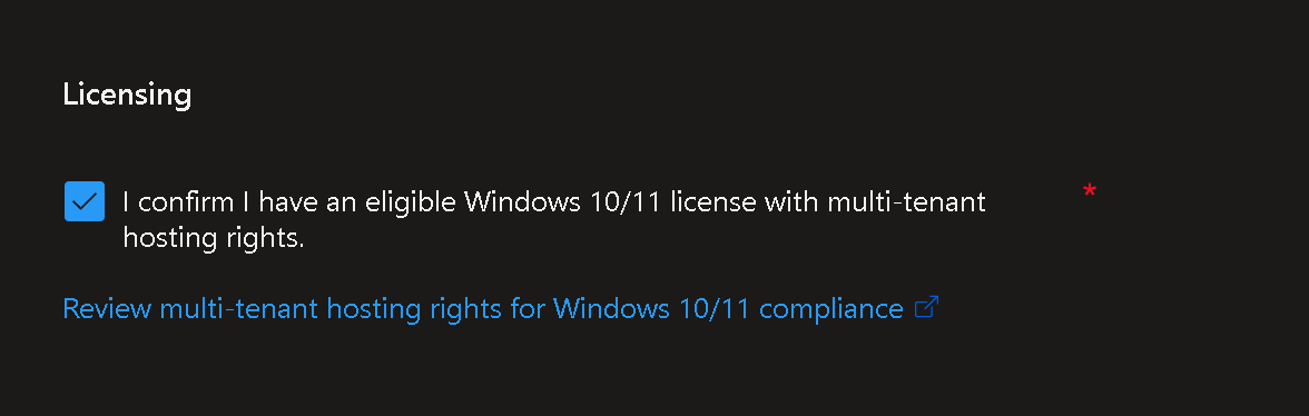 Important: Be sure to select the check box confirming 'I confirm I have an eligible Windows 10 license with multi-tenant hosting rights'.Without this selected, it will not allow the validation to process as "passed" successfully.