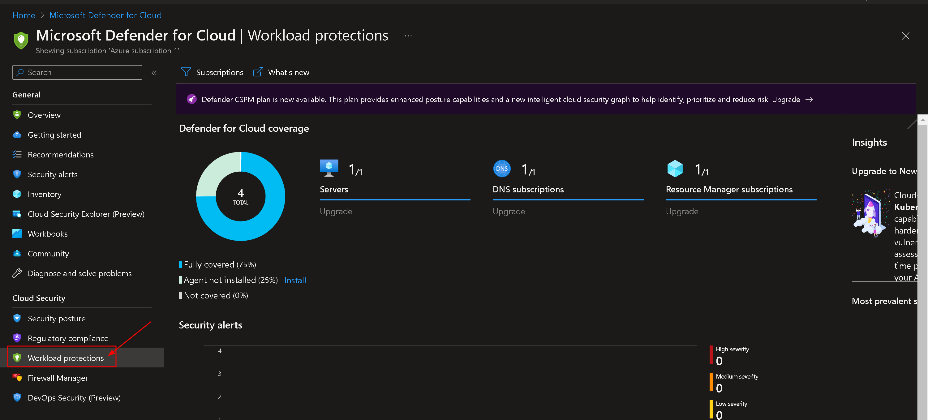 After enabling the plan, navigate back to the homepage for Defender for Cloud and select 'Workload Protections' on the left pane. That will then present the following screen: