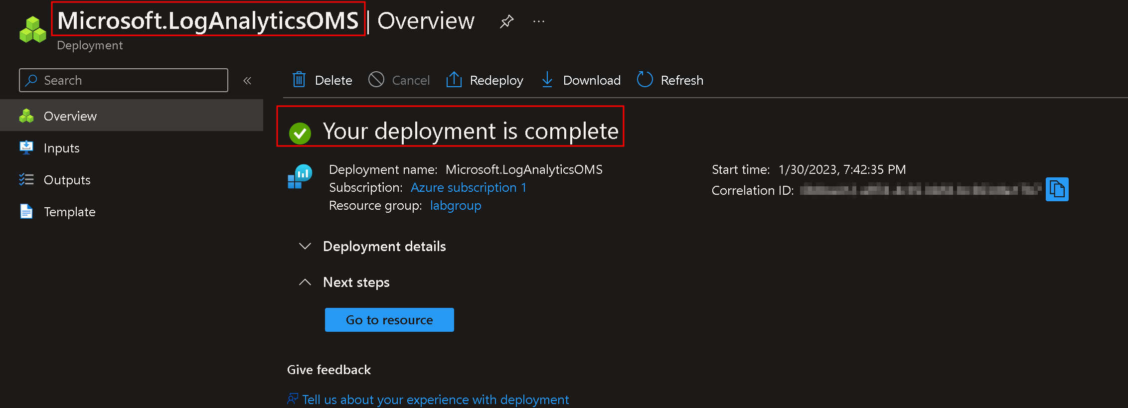 Click “review + create” to create the Log Analytics Workspace. Then choosing "Create" to finalize the creation of the workspace, you are presented with the following page.