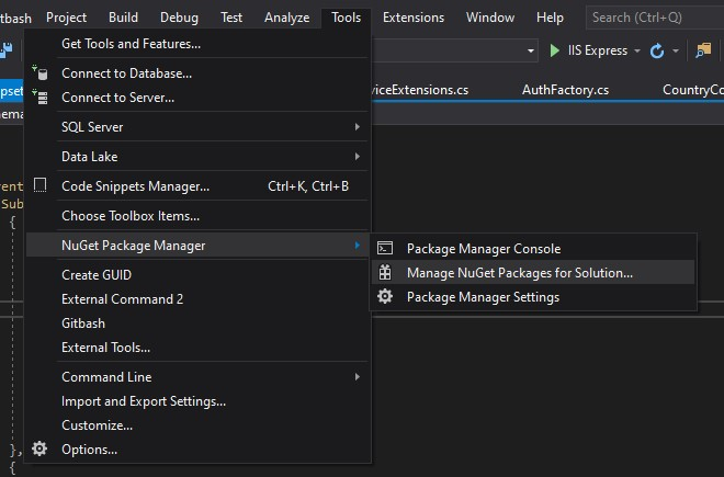 Tools > NuGet Package Manager > Manage NuGet Packages for Solution...