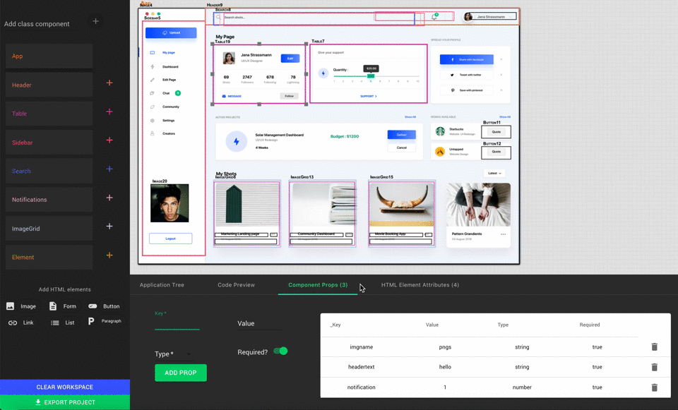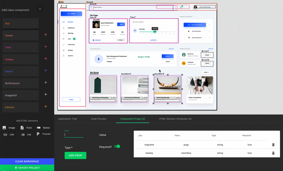 - The bottom panel allows the user to toggle between 4 different views: a tree diagram of the application, a real-time preview of the exportable code, a form to enter component props, and a form to add HTML attributes.