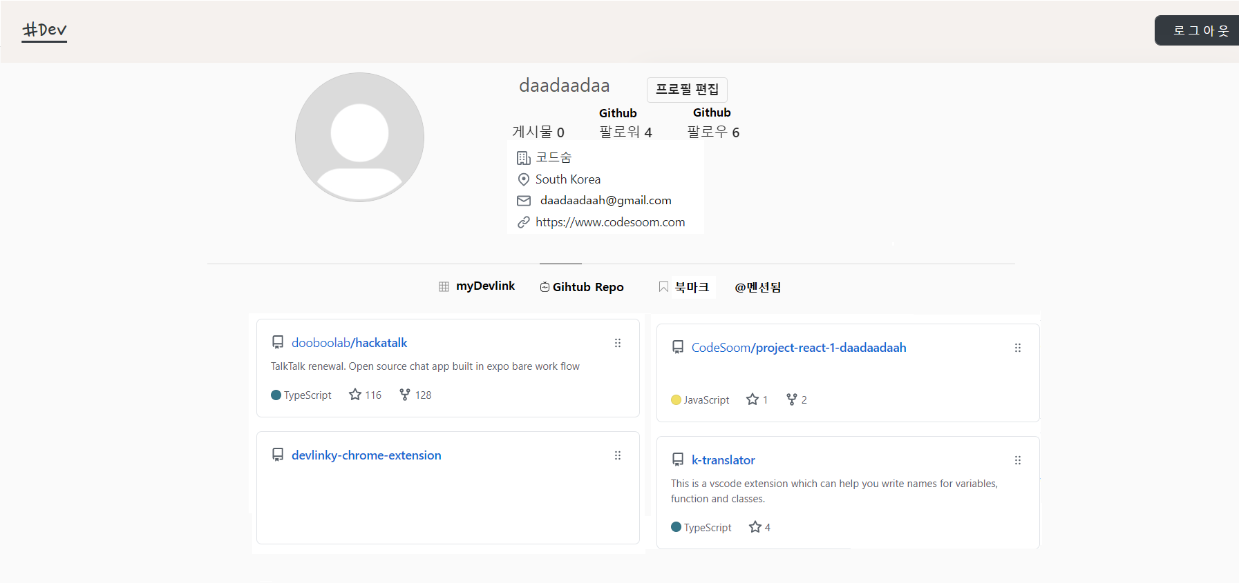 - 회원 Github ID 및 Github 프로필 사진 보여주기 [UserPage] 사용자는 자신 또는 다른 사용자의 Github ID 및 Github 프로필 사진을 볼 수 있다. #108