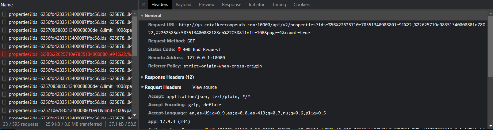 @acedward @agallardol a mi también me ocurrió algo raro, bajo el modelo de datos de un answer y de una question de tipo survey+property, el "responses" es un array de properties en formato JSON String. Sin embargo, aquí el preload pasando un array de properties me da error justamente en la llamada de red que muestra @maramire porque intenta pasar el objeto completo. Lo que me funciona es lo siguiente: Sin embargo, si hago lo siguiente: La query que muestra Matías sigue funcionando igual y retorna 200, pero no se precarga la question: Y si hago lo siguiente: Trata de hacer una query de red por las properties, pero da BAD_REQUEST: |
