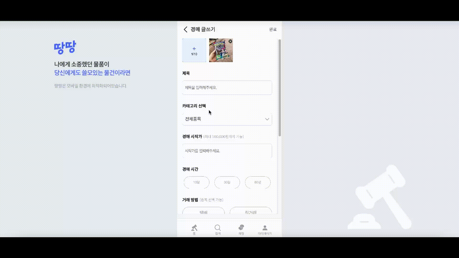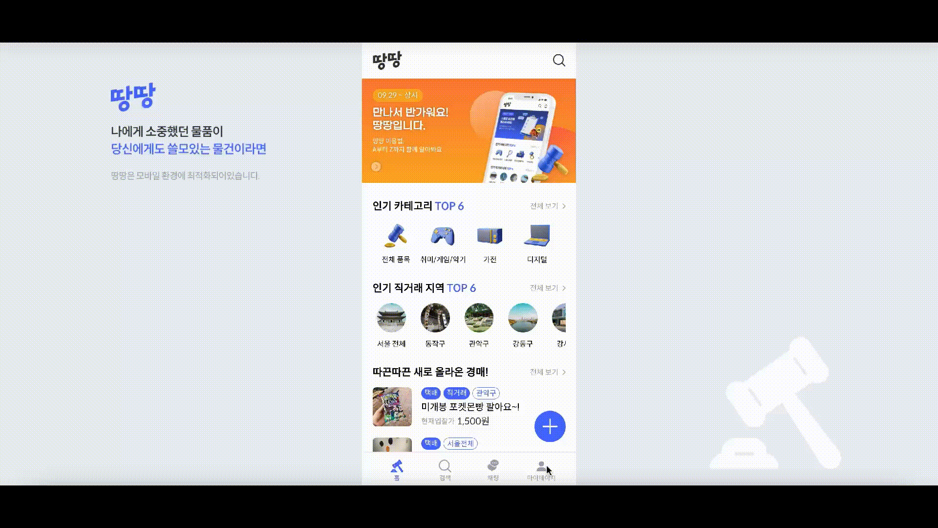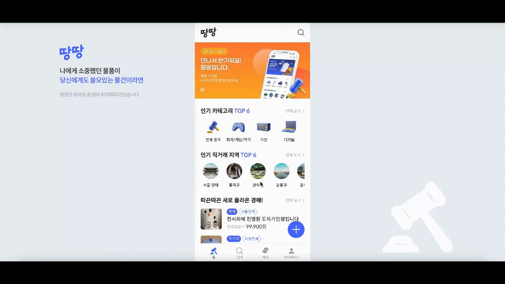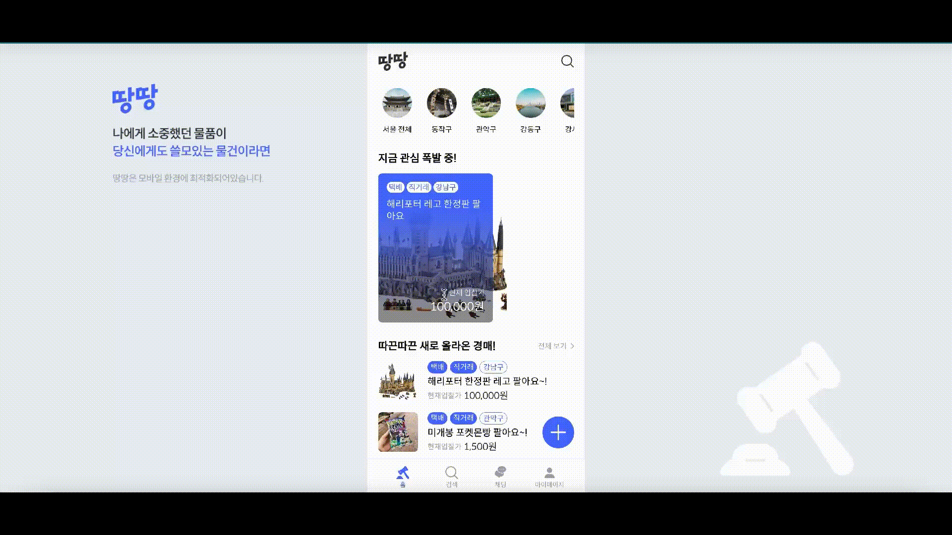 전 세대를 아우르는 중고거래에 대한 의식이 긍정적으로 변화함에 따라 "땅땅" 은 이색적인 경매 서비스 경험을 제공하고자 합니다.