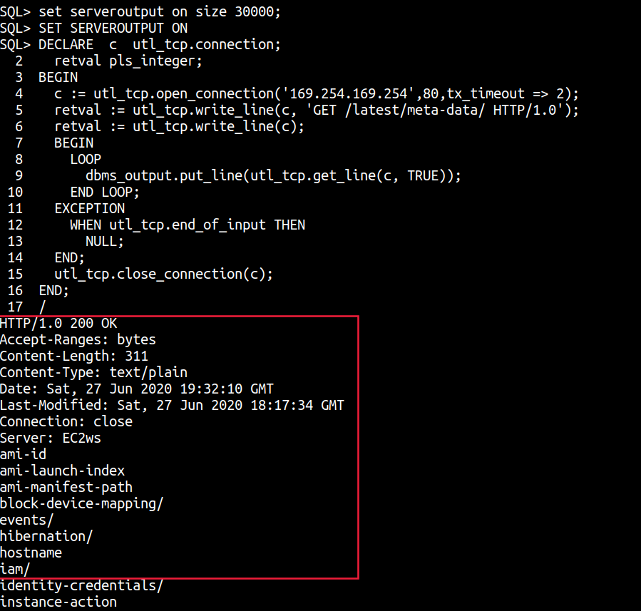 retval := utl_tcp.write_line(c, 'GET /latest/meta-data/ HTTP/1.0');