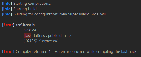 The complete mode is the same as the base Kamek one, meaning it has all the other stuff, but with colors, spacing and the correct line number for the errors / warnings whereas the simple mode is a lot more compact and only shows essential information (and the only one true error instead of 1041 unrelated ones).