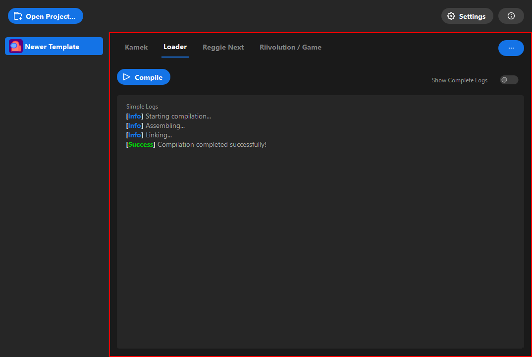 Here you can create and edit the loader for your game. The compiler has 2 modes: simple and complete.