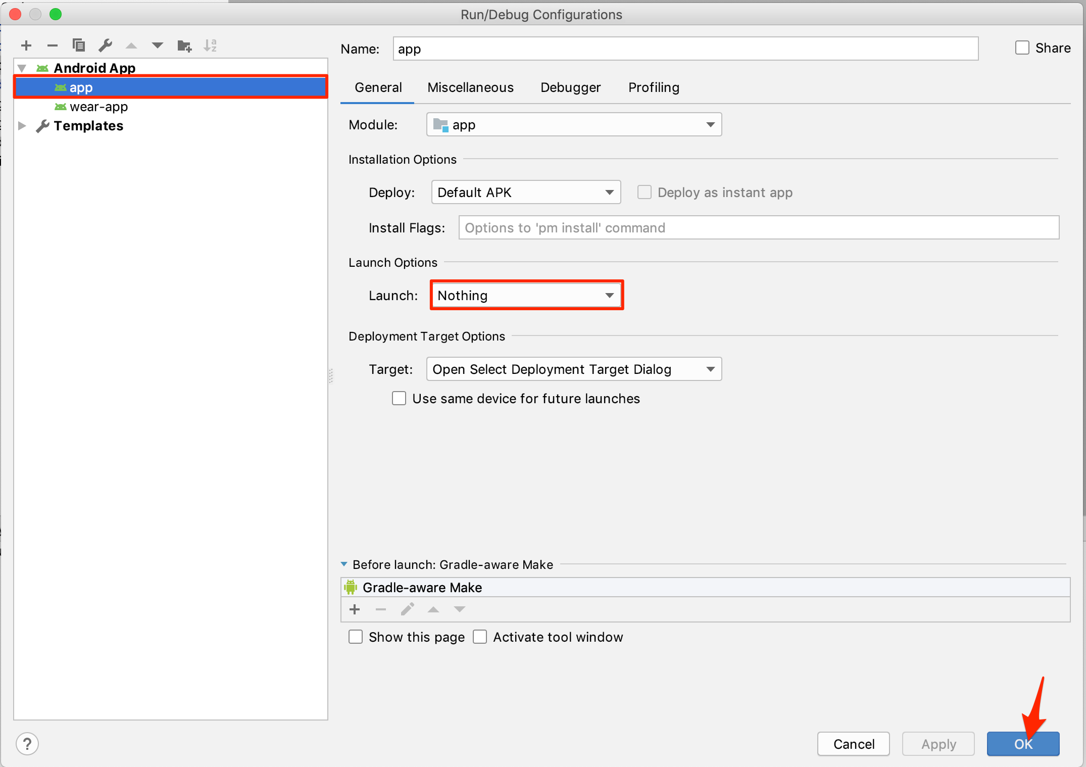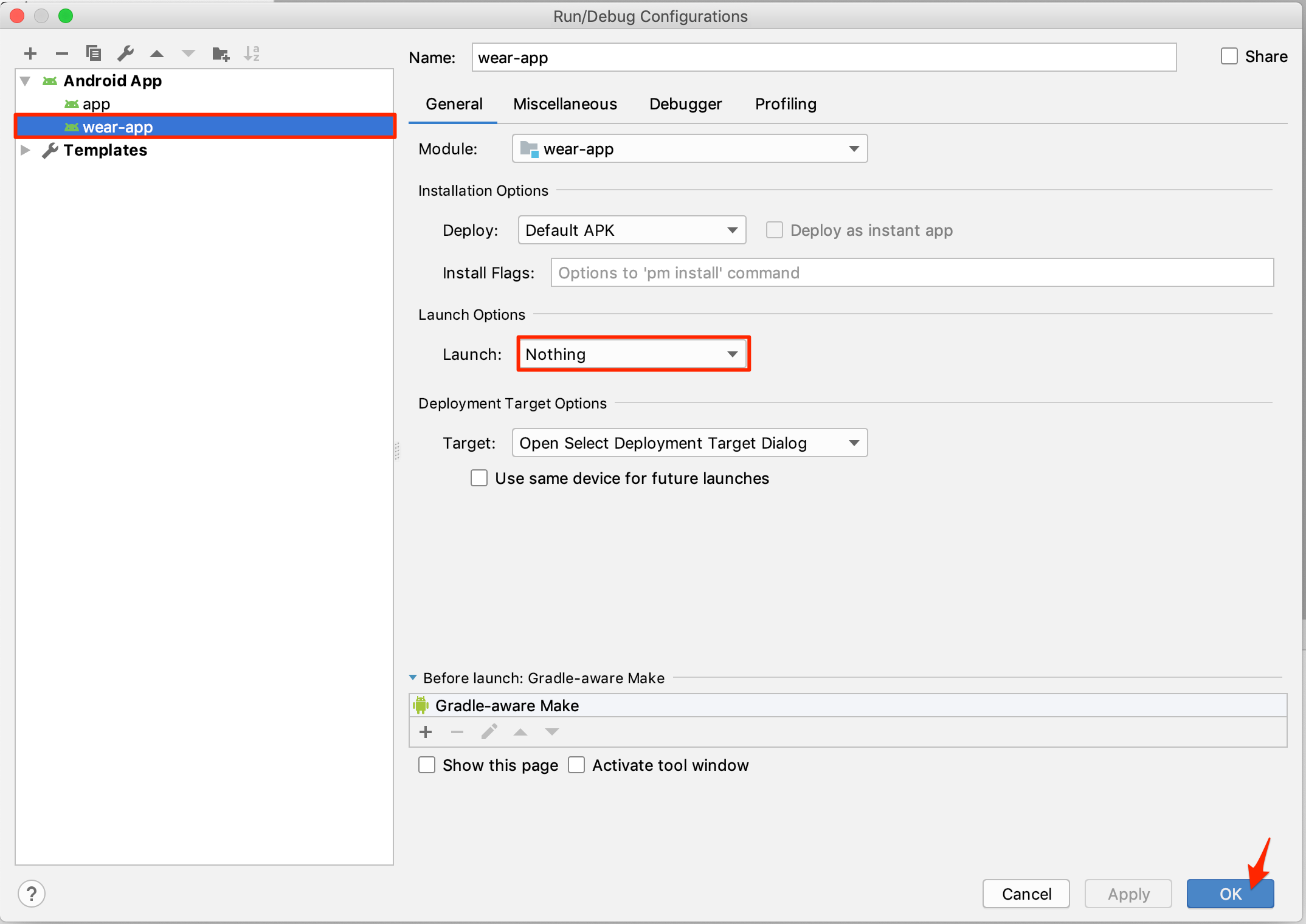 新しくウィンドウが出てきます。まず左側のAndroid App内のwear-appを選択すると右側のような画面が出てきます。 そこで、[Do not launch Activity]を選択してOKを押してください。