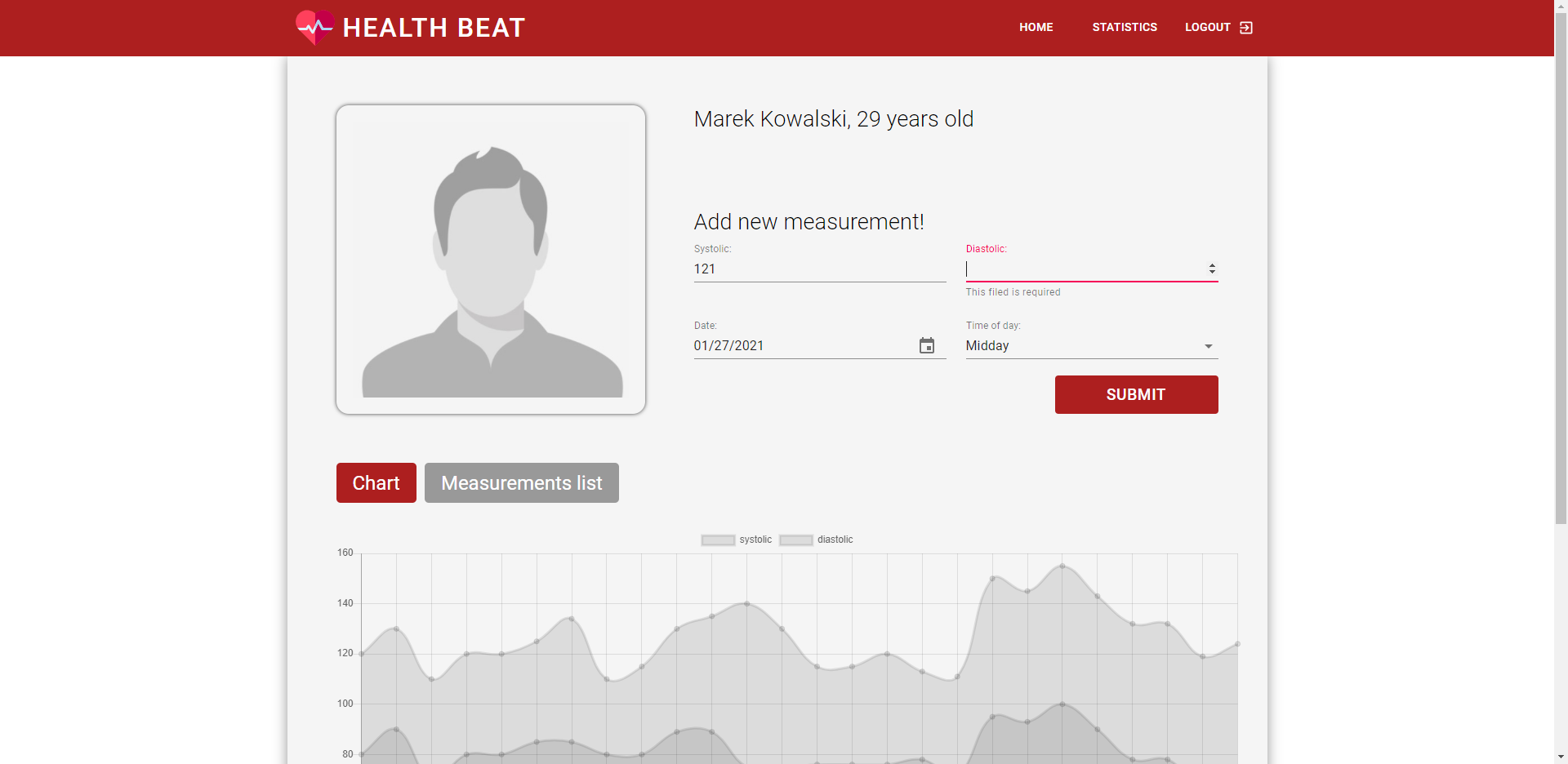 Aplikacje webowa pozwalająca zalogowanym użytkownikom na wprowadzanie pomiarów ciśnienia krwi w danym dniu i o konkretnej porze dnia. Aplikacja została stworzona z w sposób umożliwiający zapisywanie danych pomimo braku połączenia z internetem (w trybie offline przeglądarki, który należy ręcznie włączyć). Po ponownym nawiązaniu połączenia (powrotu do trybu online) dane są automatyczne synchronizowane ze zdalną bazą danych. Istotnym aspektem jest wymóg bycia wcześniej zalogowanym aby móc działać w trybie offline - wymagana jest obecność tokenu uwierzytelnienia w localStorage.