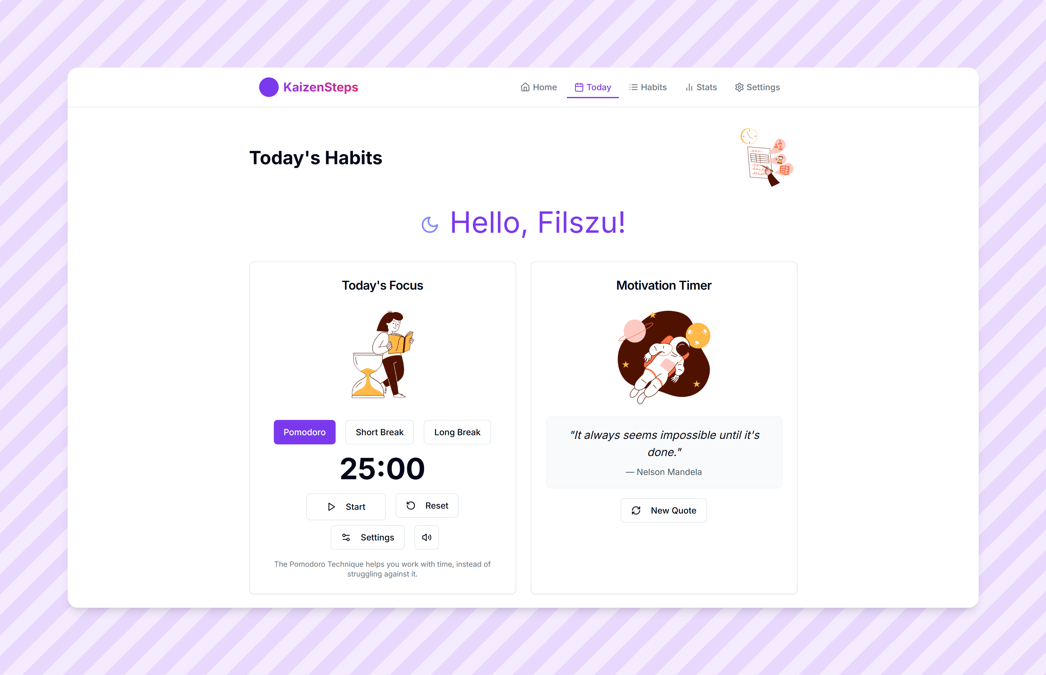 Kaizen Steps is a beautiful designed habit-tracking and self-improvement platform designed to help users develop positive habits through incremental progress. The app integrates daily habit tracking, templates, stats visualization, and productivity-enhancing features like the Pomodoro timer with motivational quotes.