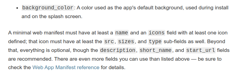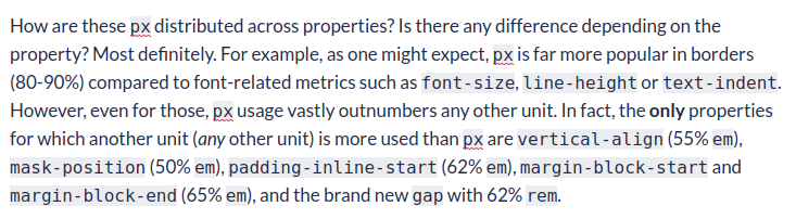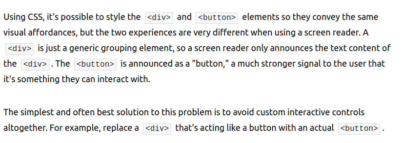 @rviscomi sure, you can open almost any docs site, and you see the inline code blocks visually differ from the rest of text. Python docs https://docs.python.org/3/tutorial/datastructures.html#more-on-conditions MDN https://developer.mozilla.org/en-US/docs/Web/Progressive_web_apps/Installable_PWAs Web.dev https://web.dev/pl/semantics-and-screen-readers/ I would increase leading line spacing for paragraphs, just compare: