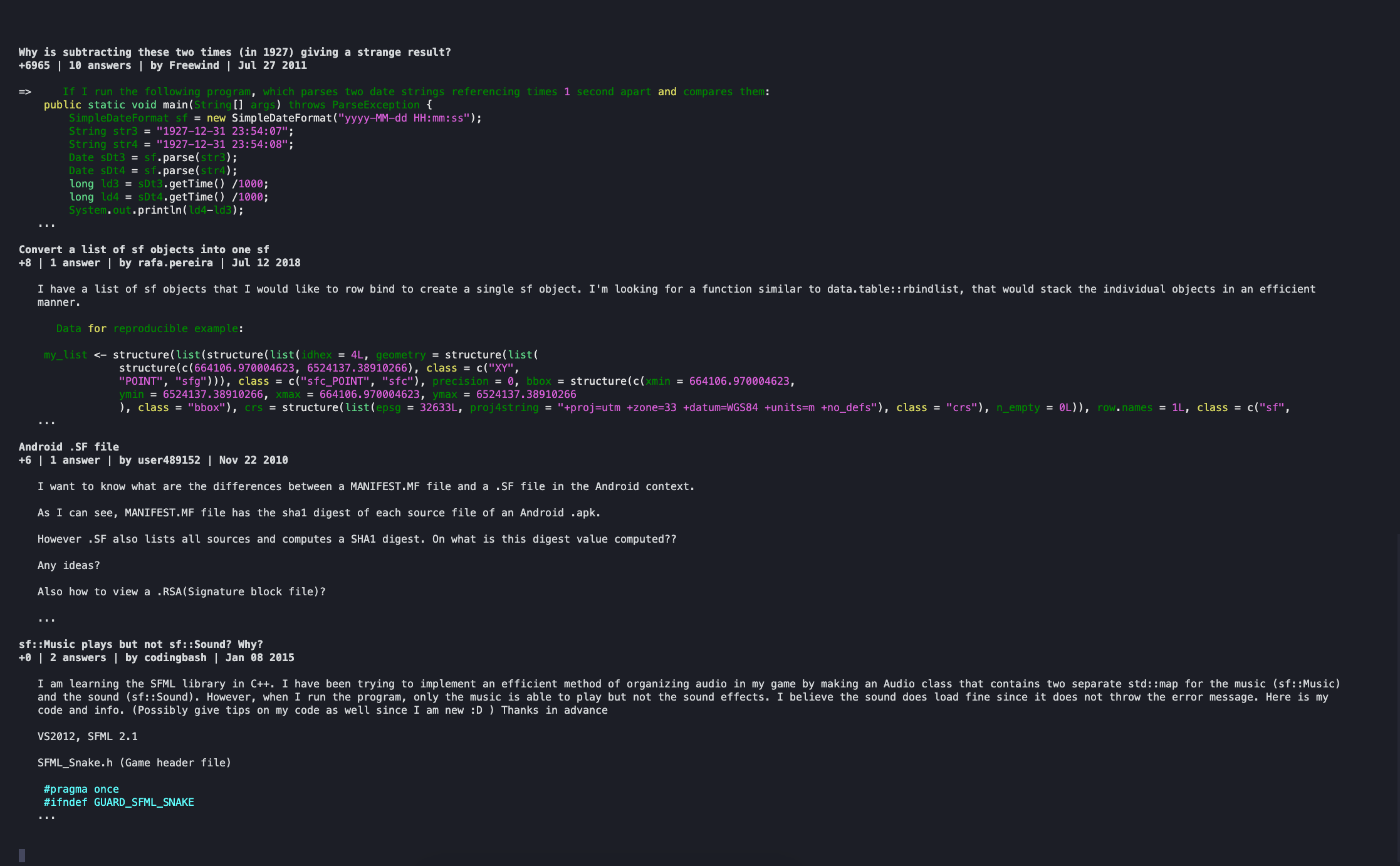 One thing that should be noted is that the body of a StackOverflow question is returned as a mix of HTML Markdown. We render this using Lynx to uphold the formatting of the question.