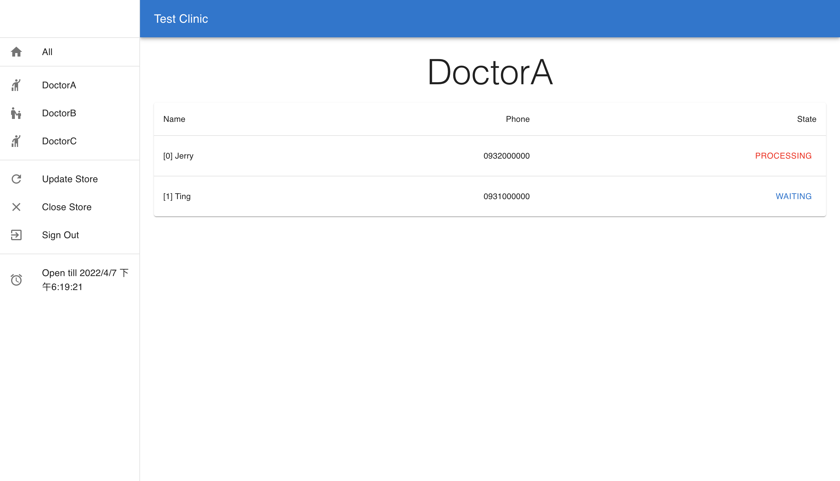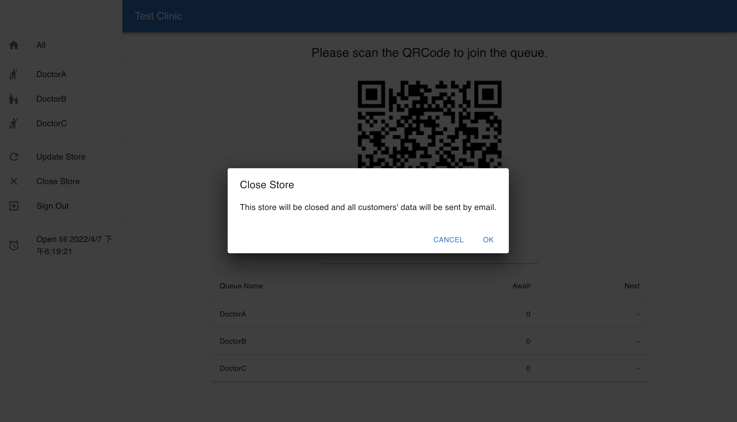 Every account will persist for 24 hrs. After 24 hrs, Queue System will suspend the account (a.k.a. close store). Once the store is closed, Queue System will send a CSV report to the store owner and delete its related data in the database. This CSV file contains all customers' detailed information to let the store owner implement further business analysis. Next time, the store owner can signup an account again (a.k.a. open store) to use Queue System.