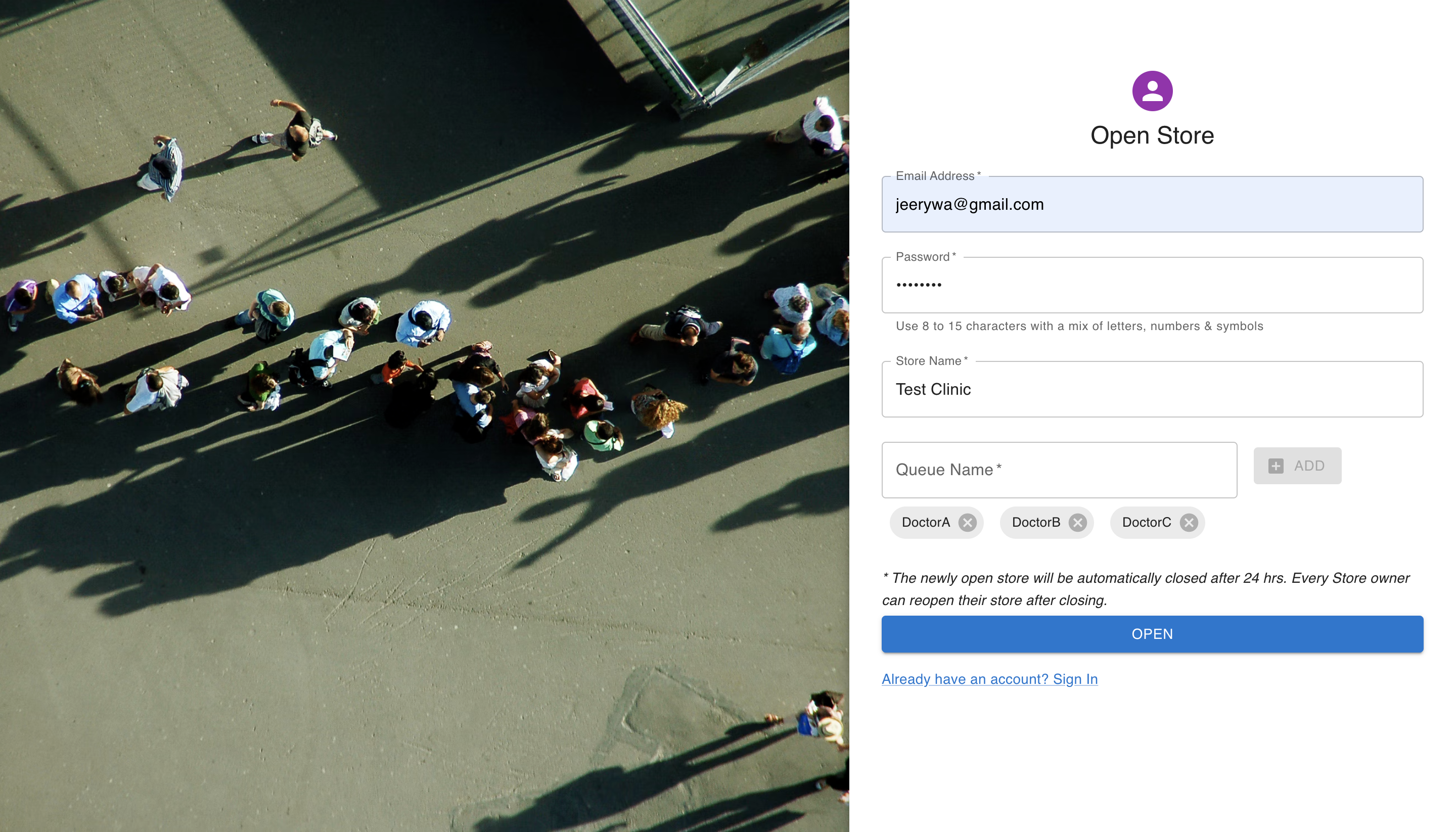 - Every account will persist for 24 hrs. After 24 hrs, Queue System will suspend the account (a.k.a. close store). Next time, the store owner can signup an account again (a.k.a. open store) to use Queue System.