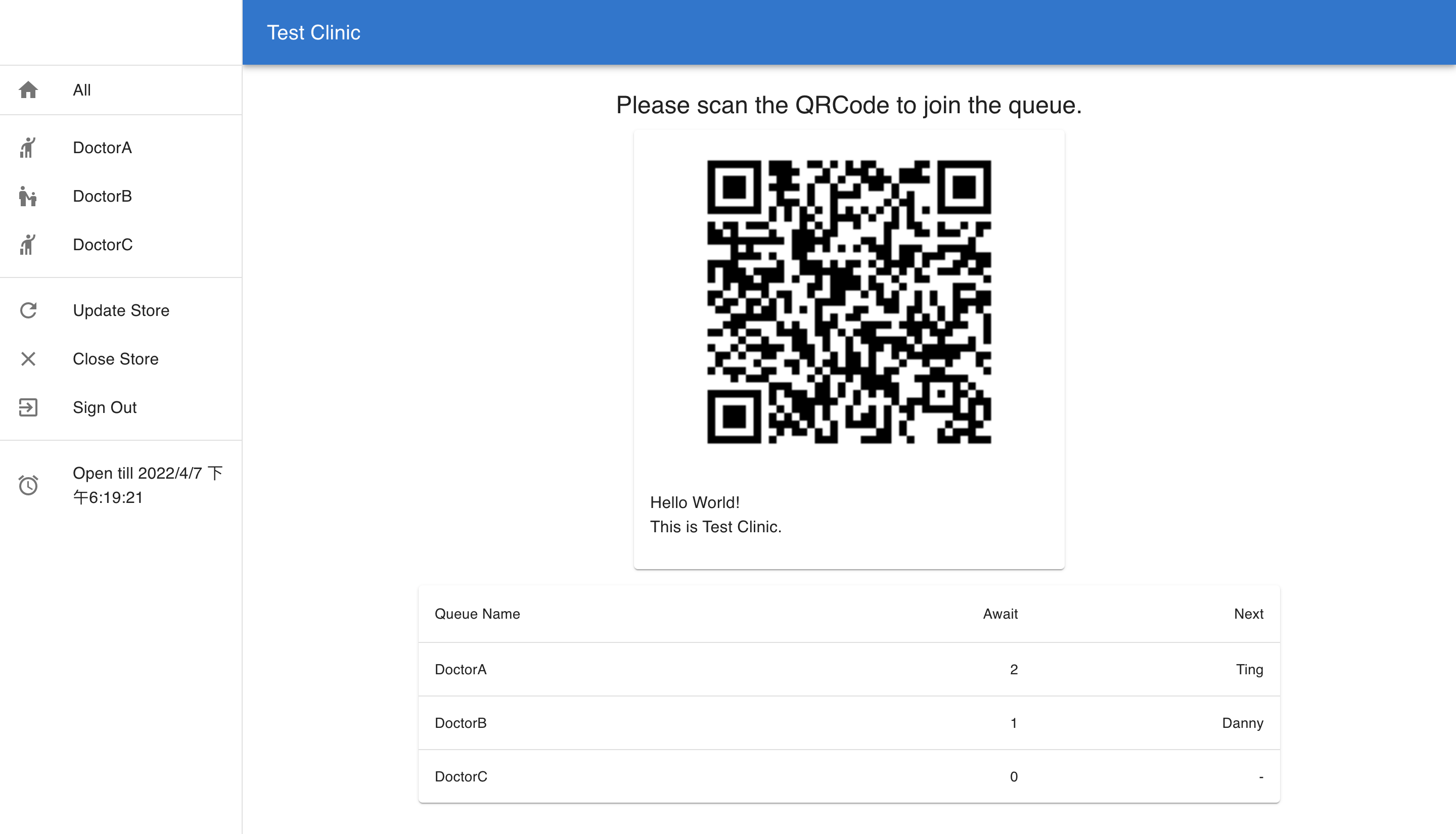- The store owner can see the summary of all queues and the QRcode block after signing into their account.