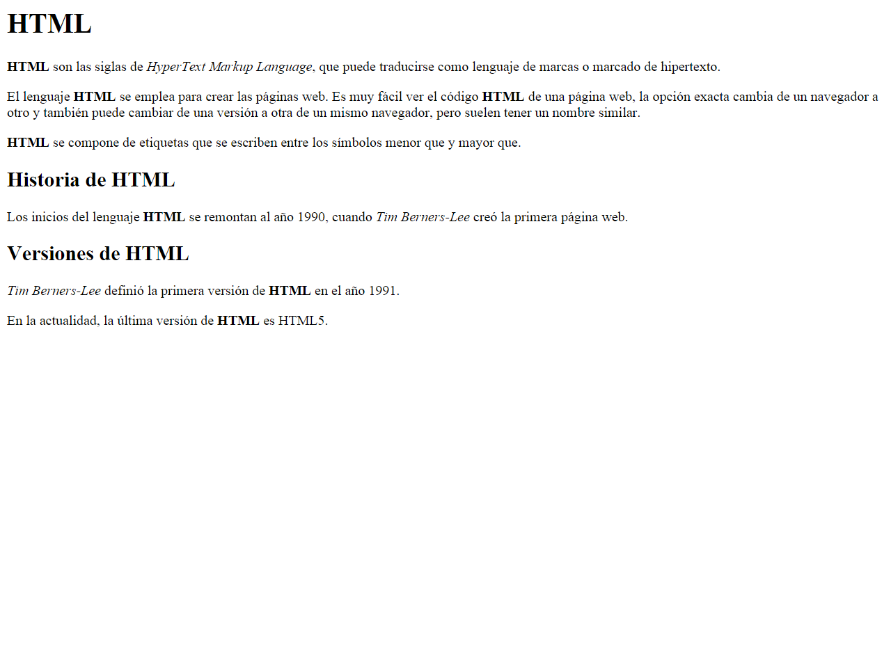 Las siglas HTML deben aparecer como texto destacado en toda la página. Tim Berners-Lee debe aparecer como texto enfatizado en toda la página. Debes añadir el siguiente contenido: Un encabezado de nivel 1 con el texto "HTML" antes de "HTML son las siglas de..." Un encabezado de nivel 2 con el texto "Historia de HTML" antes de "Los inicios del lenguaje HTML..." Un encabezado de nivel 2 con el texto "Versiones de HTML" antes de dos nuevos párrafos que contienen el texto "Tim Berners-Lee definió la primera versión de HTML en el año 1991" y "En la actualidad, la última versión de HTML es HTML5".