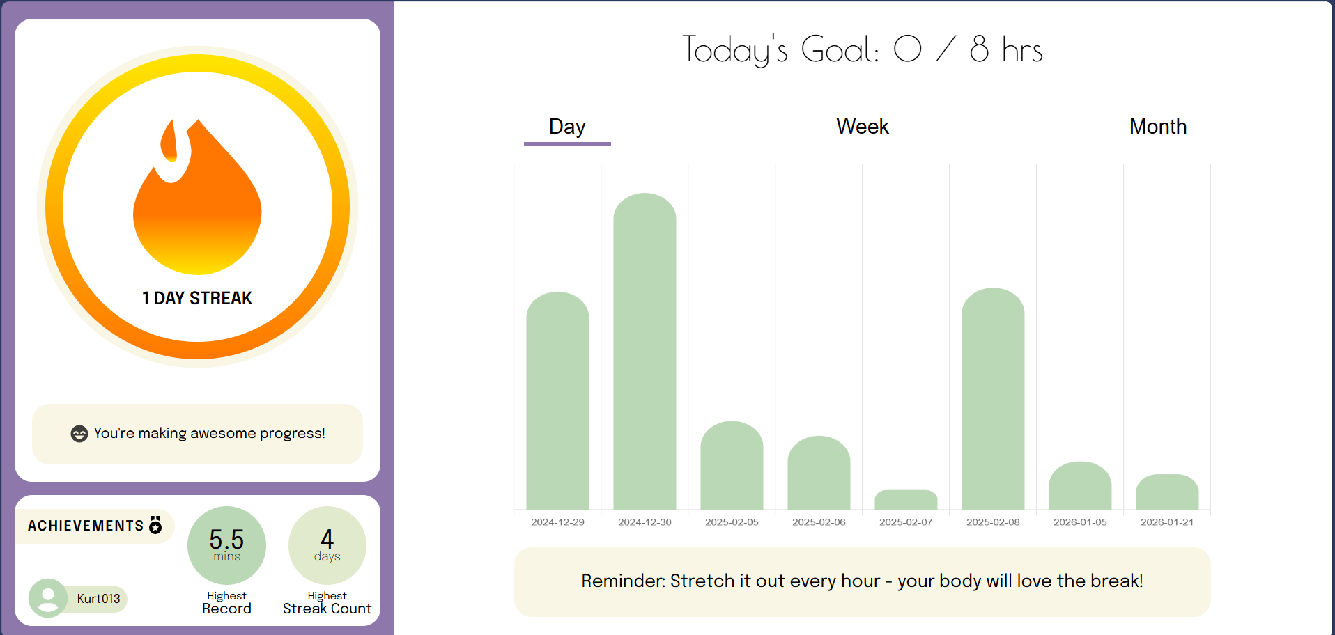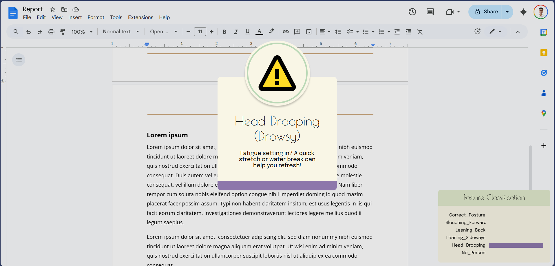 - Posture, stretching, and hydration reminders
