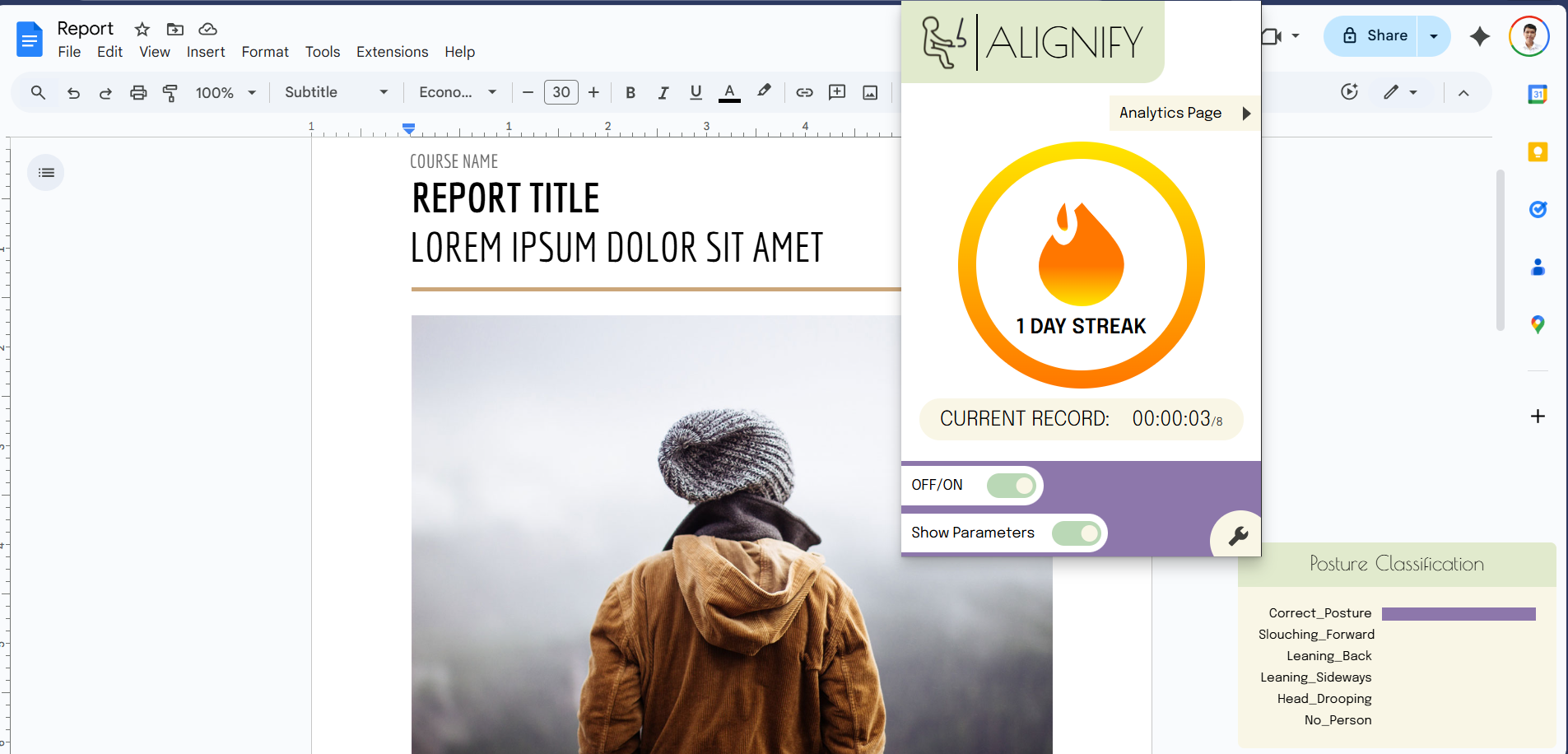 Chrome extension (Manifest V3) that helps people who sit for long periods improve posture through progress tracking, reminders, and motivation.