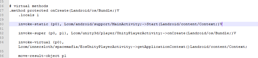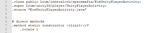 With the path of the target game’s main activity which we determined earlier com.unity3d.player.UnityPlayerActivity. Think of it like a path /com/unity3d/player/UnityPlayerActivity.smali