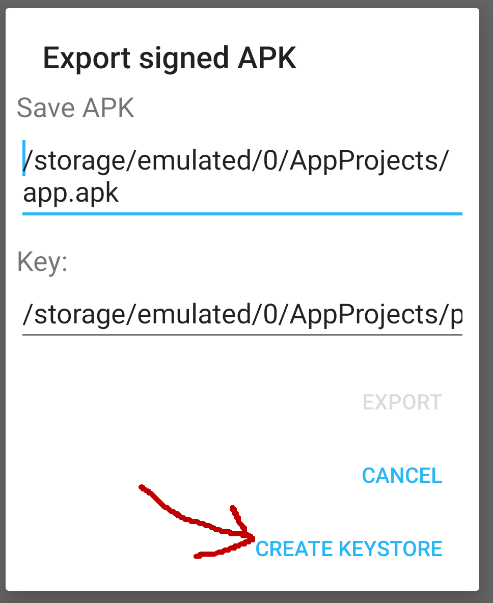 This dialog will show but why is export greyed? Because you need to create your own keystore first. Click Create keystore