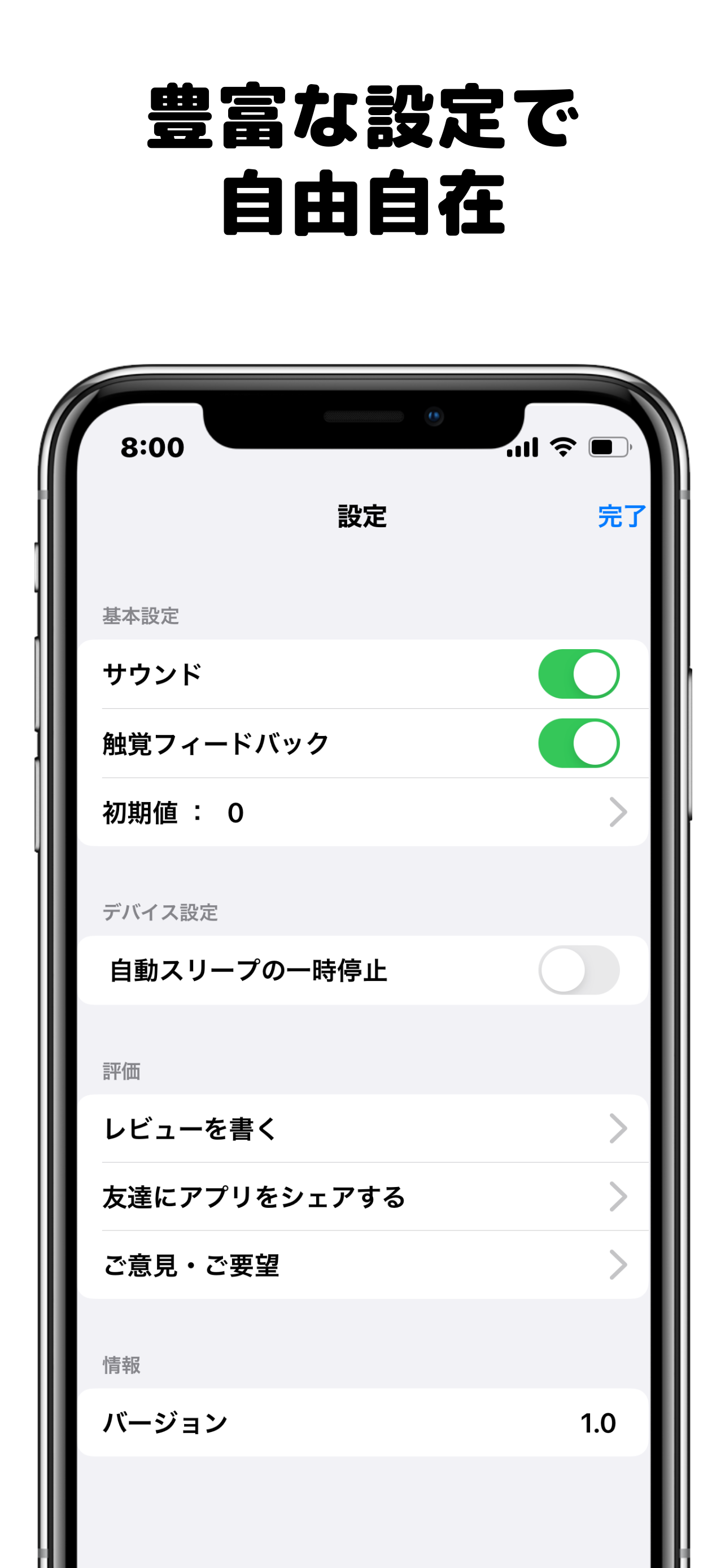 設定画面では、触覚フィードバックやサウンド機能を追加・削除できます。