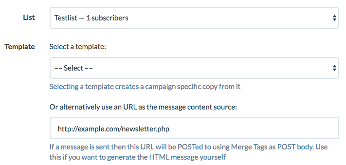 When setting up a new campaign you can either select a template or an URL as the message contents. If you choose an URL then every time a message is sent or a message is rendered in the browser (through View this email in your browser link), a POST request is made against that URL. Request body includes all merge tags related to this subscriber the messages is rendered for.