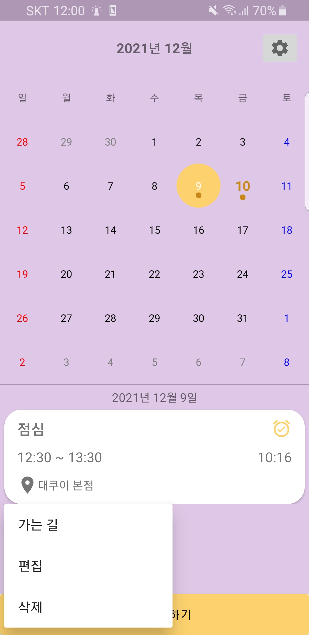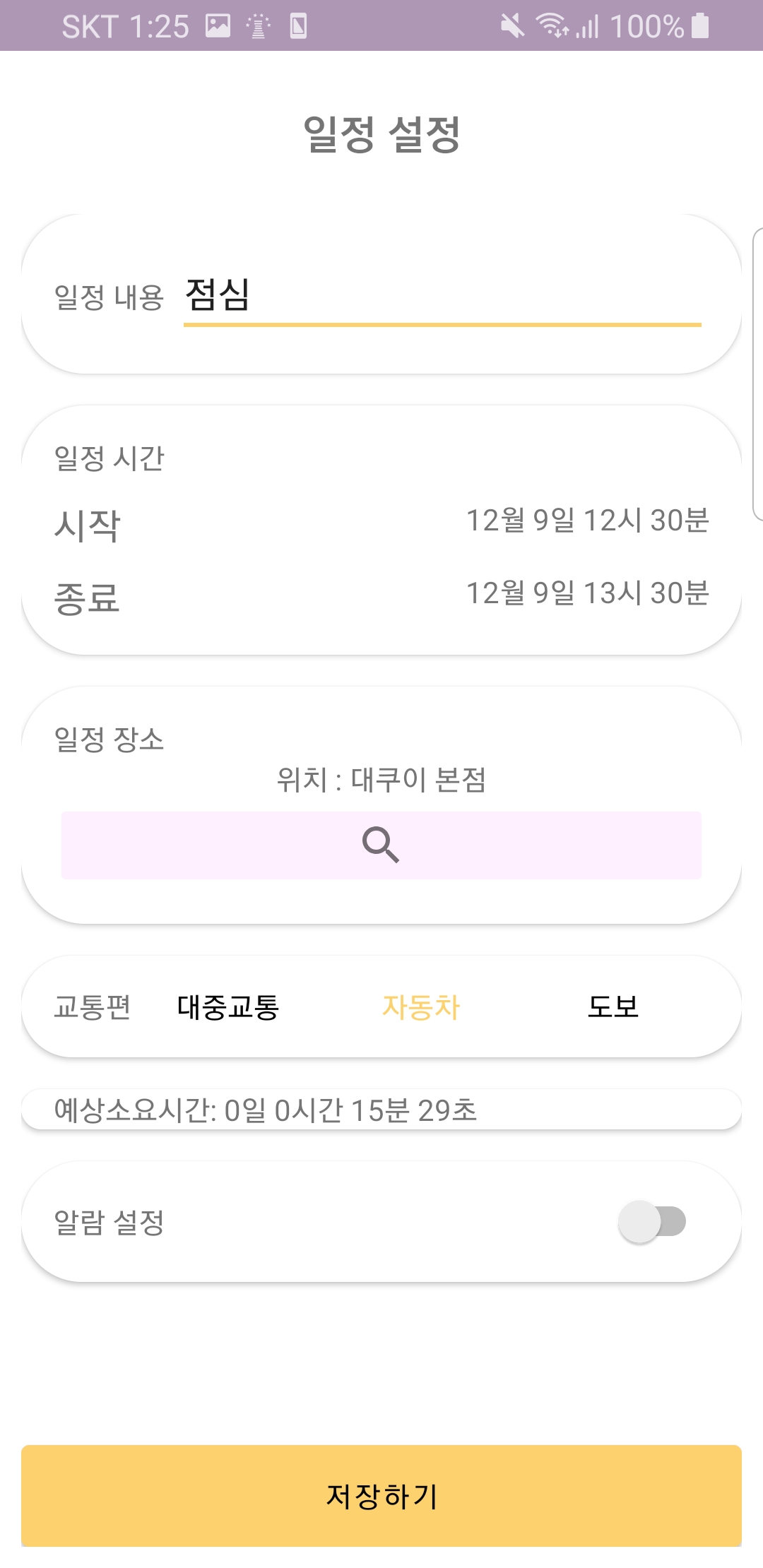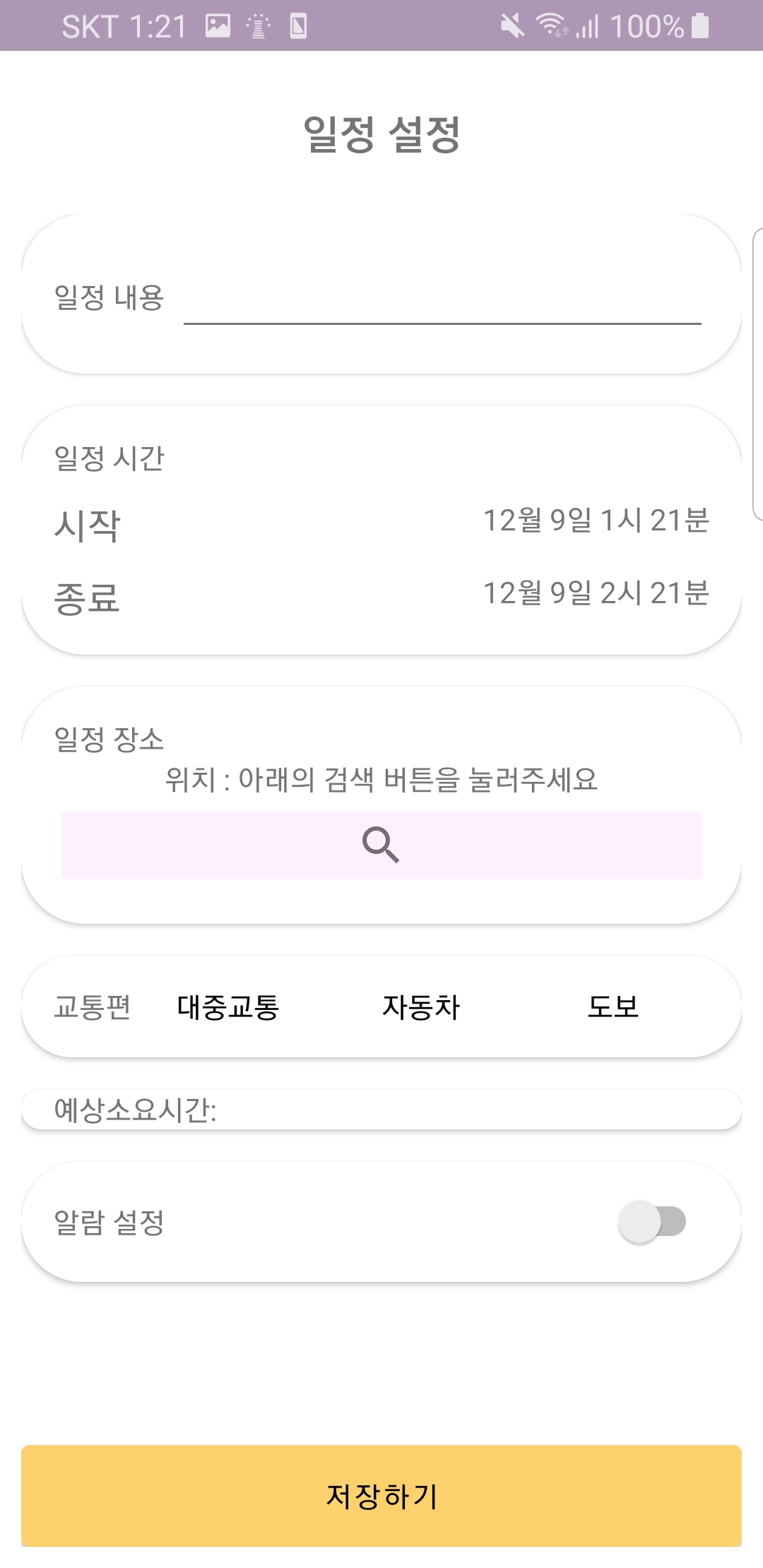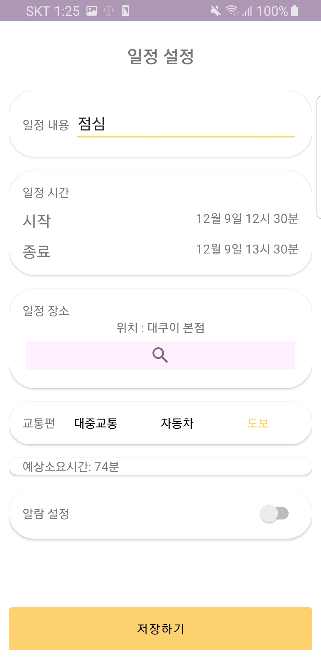 지도 앱의 소요시간 계산, 길 찾기 기능과 알람, 캘린더를 통합한 일정 관리 어플입니다