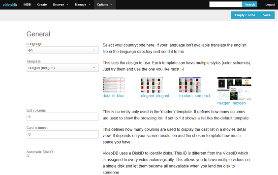 VideoDB is a PHP-based web application to manage a personal video collection. Multiple video types are supported, ranging from VHS tapes and DVDs to Blu-ray discs and DivX files on hard-disc. Even video games are supported.