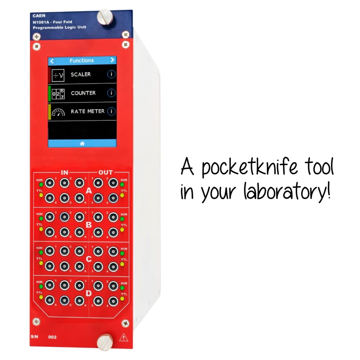 The module is organized in four sections, with 6 inputs and 4 outputs each (selectable impedance) accepting TTL/NIM signals. Each section is configurable independently according to one of the available pre-programmed functions, like scaler, counter, time stamping, digital pulse generator, etc. The section programming can be done using the 2.8” touch screen display or via the web-interface. Each section integrates a discriminator with programmable threshold and an asynchronous Gate&Delay with 5 ns resolution. This allows the user to trim at best the needed parameters and to perform accurate measurements.