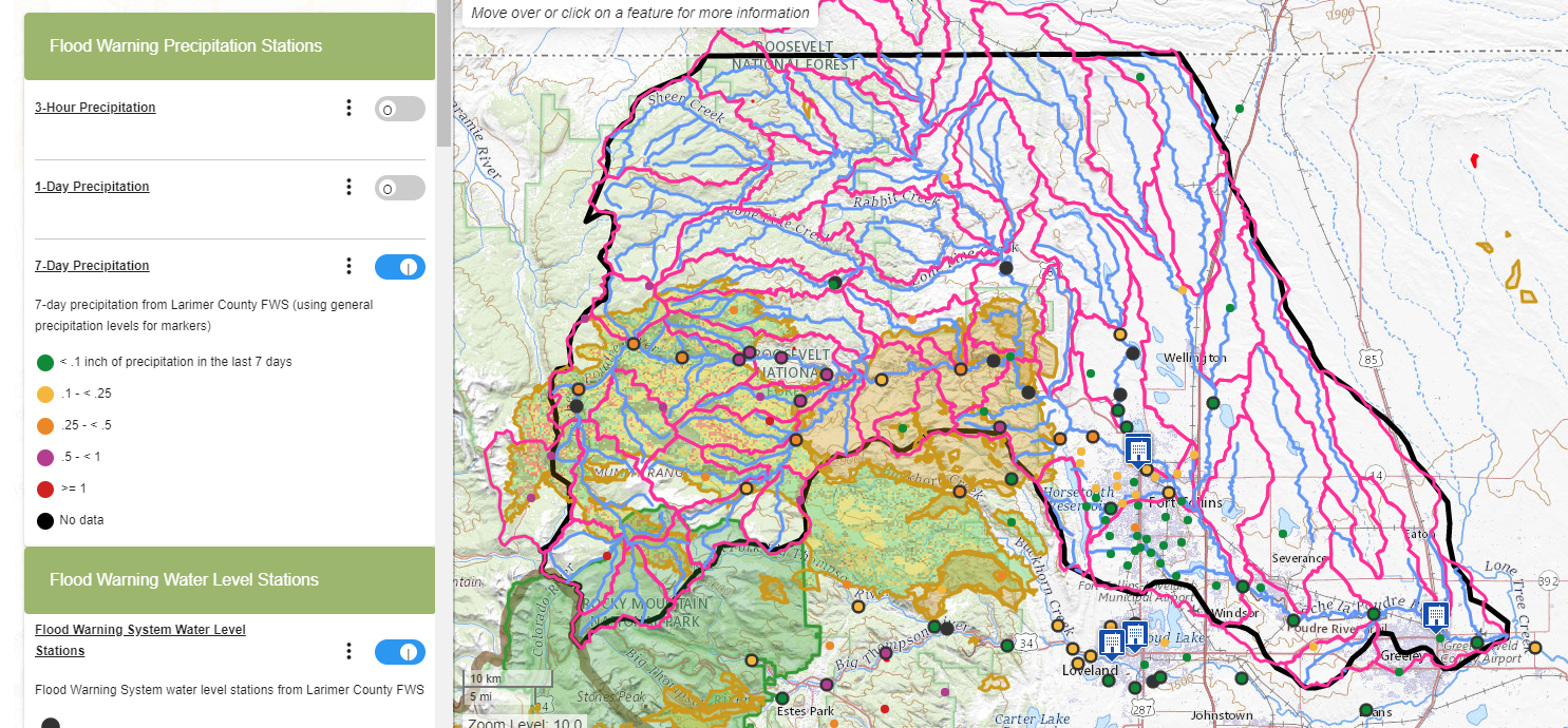 An alternate solution would be to have web services provide historical statistics in a way that supports the above use cases. This is likely already being done behind the scenes to support the DWR plots. The goal is not to replace the DWR plots, but to allow other applications to provide more specific data views (and can link back to DWR). As an example, below is a map that the Open Water Foundation has created for the Poudre, in this case showing precipitation totals over a period. However, I'd like to produce a similar map for streamflow conditions showing percent of median/mean/exceedance probability, etc.