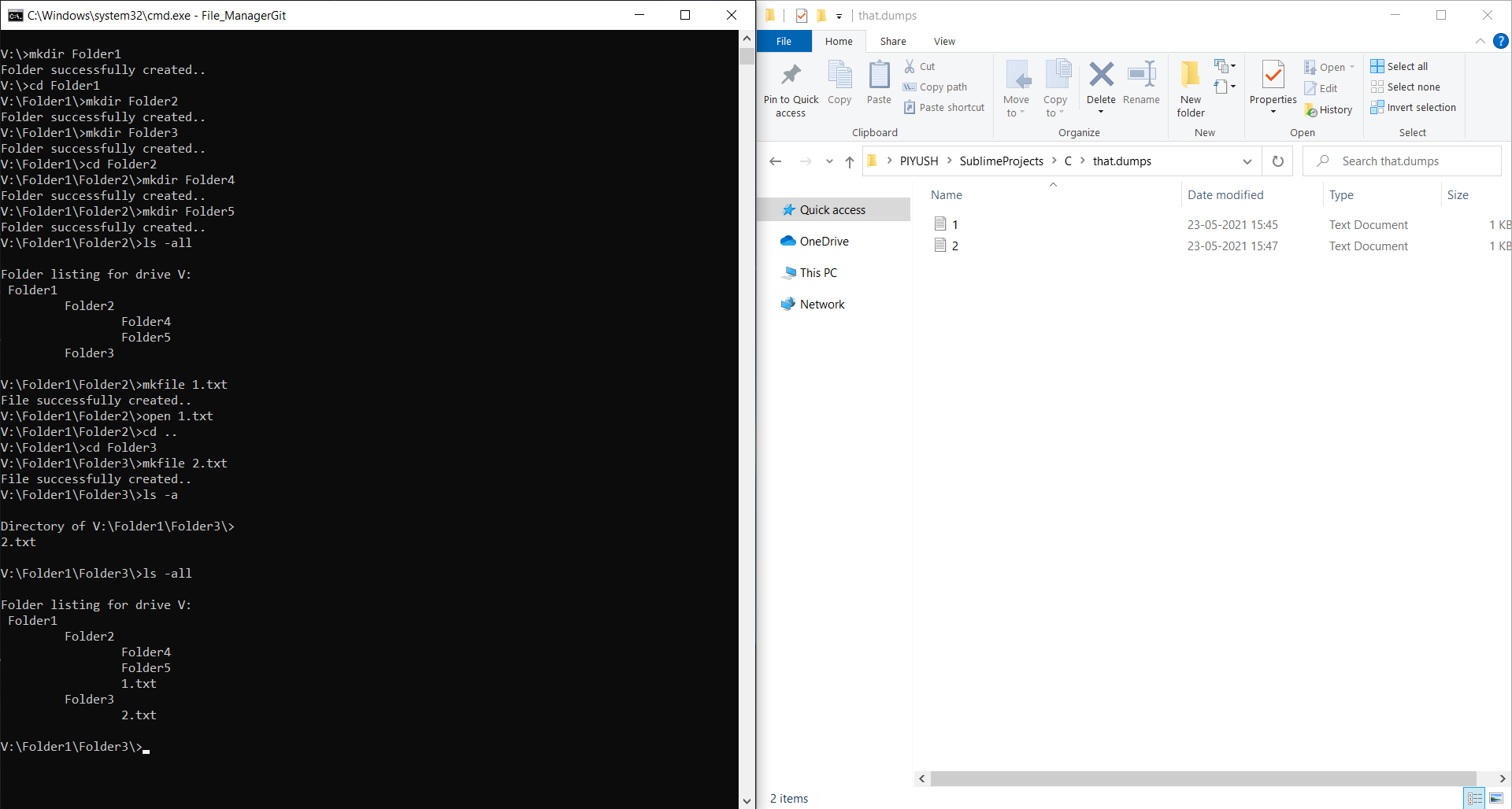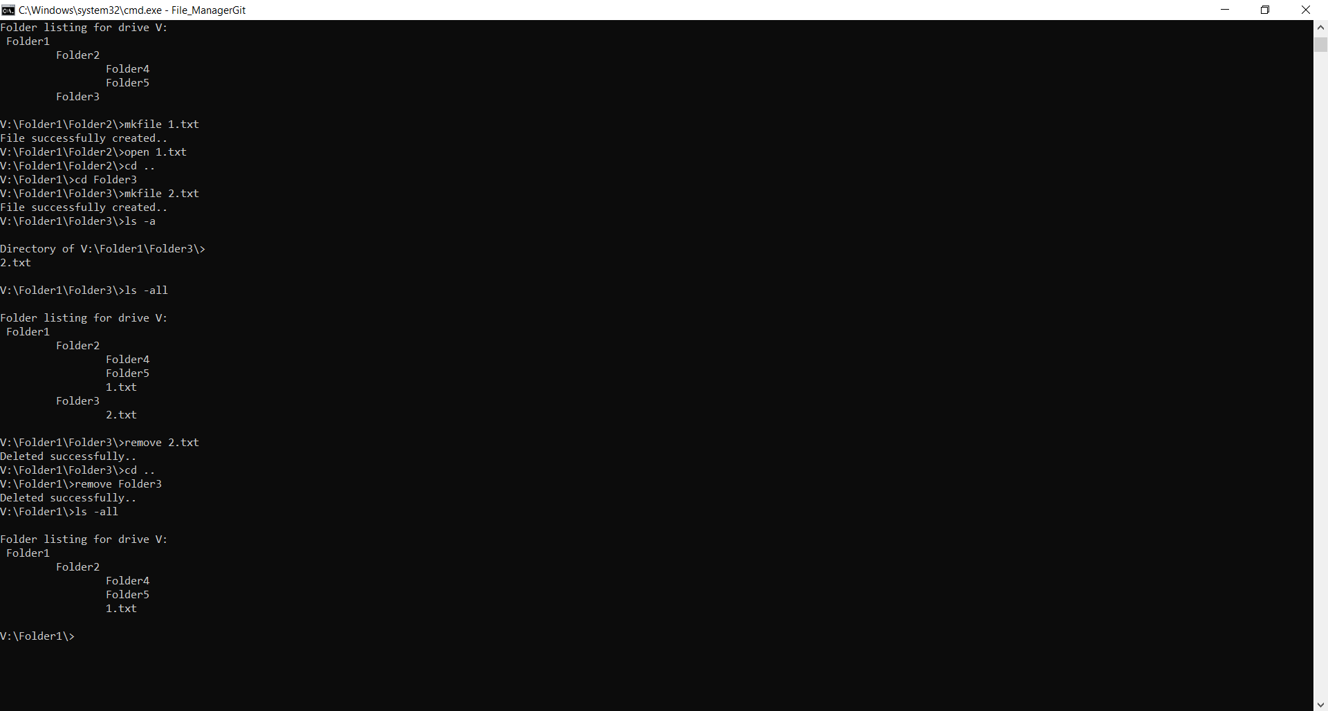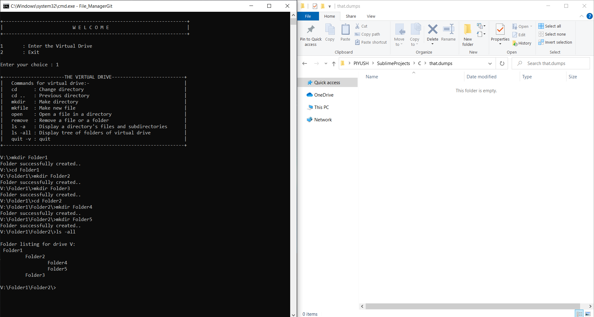 The nodes representing the folders are present only during the runtime. The hierarchy is presented as if it stored in a drive (virtual drive) but actually it is not stored in any drive. For the files, it gets stored in the memory in folder called that.dumps which is created (on the same folder where the FileManager.c file is saved in secondary memory of the user) during the runtime to store all the files created during the execution of the program irrespective of their presence in same or different directory/folder. All the files are dumped into that.dumps so it necessary to mention different filename for each file in other directories whereas same foldername can be repeated in other directories.