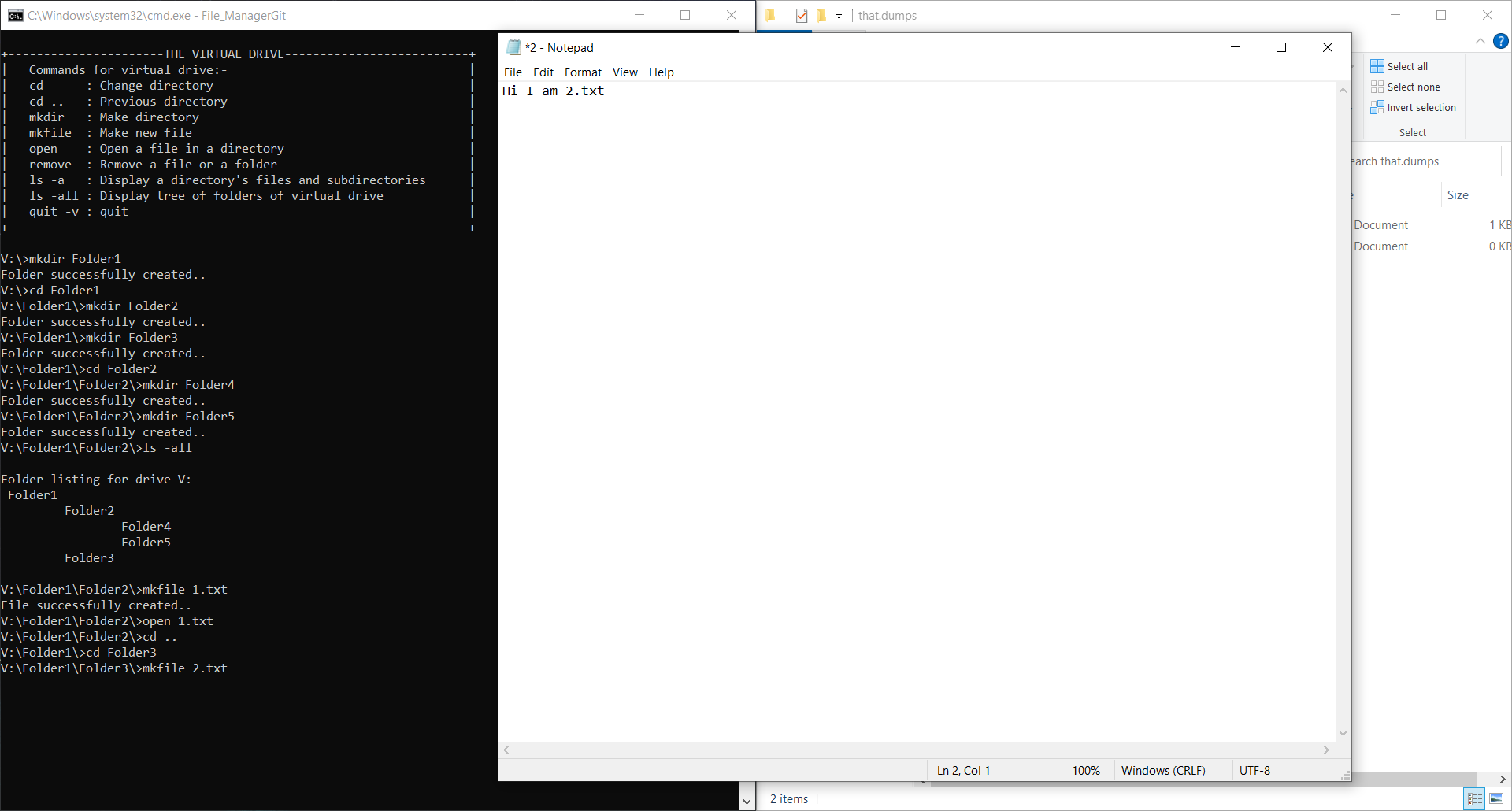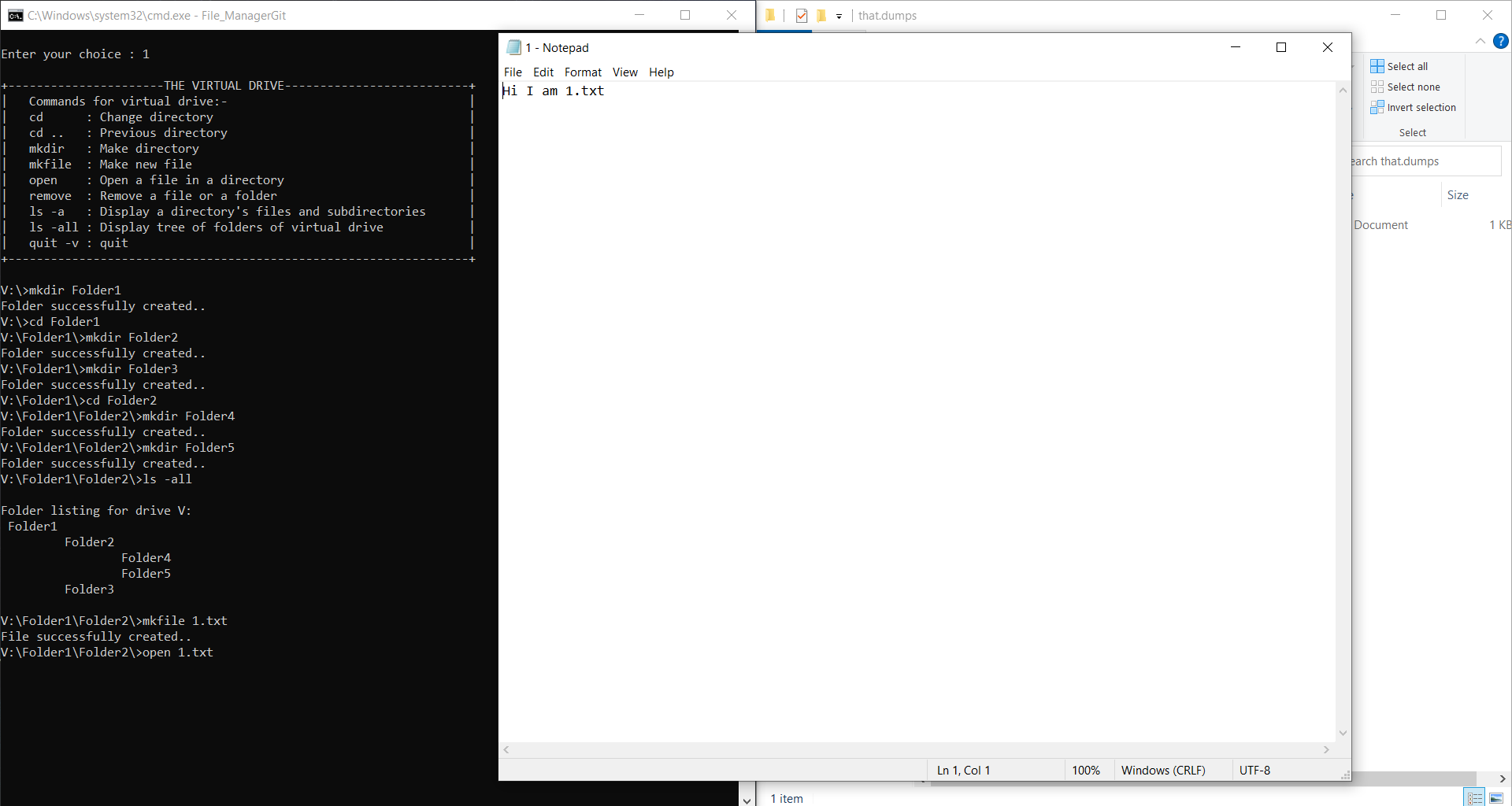 While making a file, an editor opens up to edit the file. Here I have used Notepad from Windows OS as an editor. Therefore, user can write text files and save it in the virtual directory. When the user comes out of the virtual drive, all files that were created in that.dumps during execution gets deleted to prepare that.dumps folder for a fresh start.