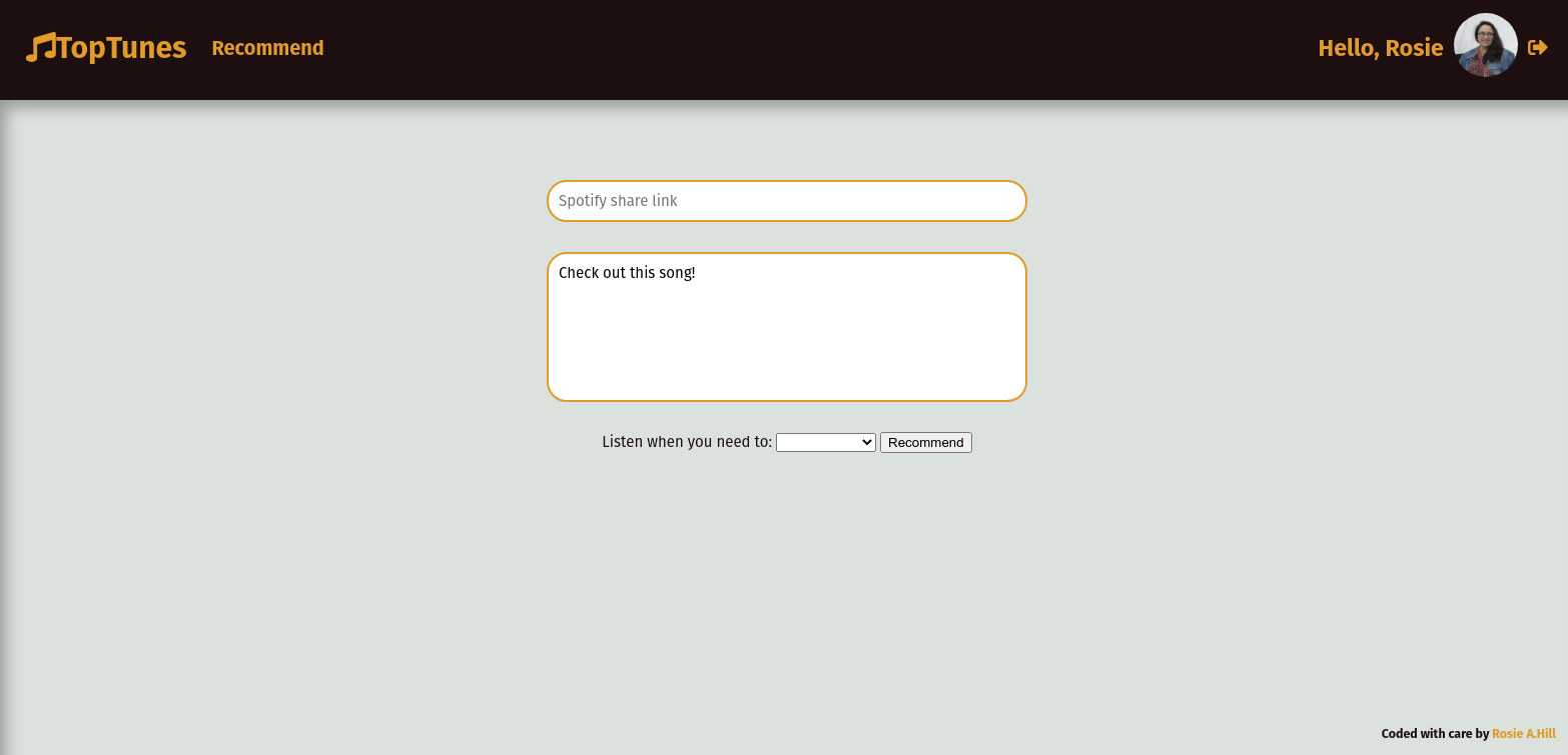 - To add a recommendation, users can sign into the app using their Spotify account, then click recommend. Paste in the share link, with any comments and the general mood.