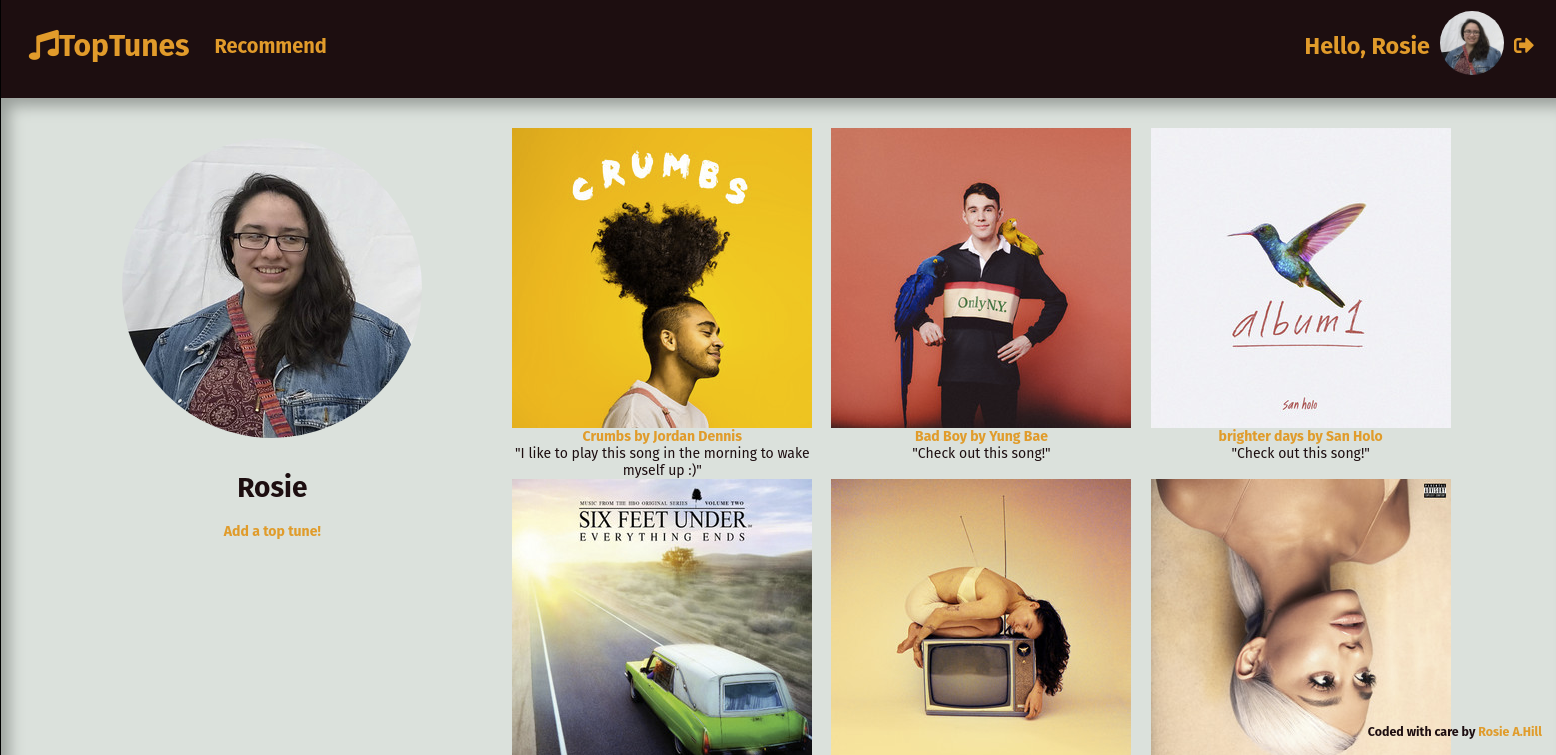 Top Tunes is a MEN stack web application built with the Spotify Web API that lets users share their favorite songs and browse other users posted songs.