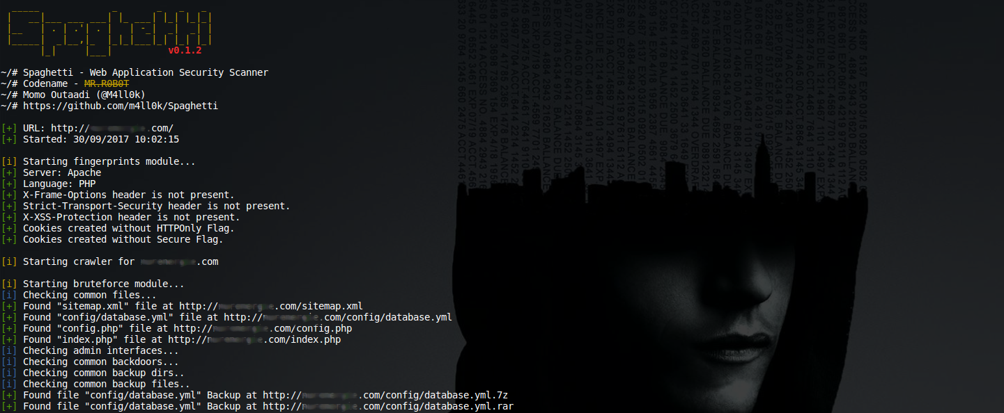 Spaghetti is an Open Source web application scanner, it is designed to find various default and insecure files, configurations, and misconfigurations. Spaghetti is built on python2.7 and can run on any platform which has a Python environment.
